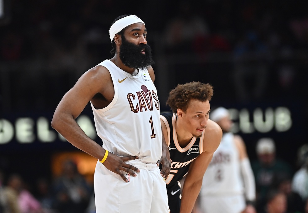 James Harden, chiamato “il Barba” per ovvi motivi, durante una partita di regular season, 10 aprile 2026 (Paras Griffin/Getty Images)