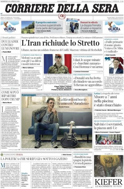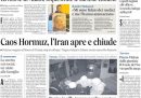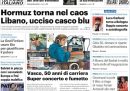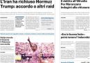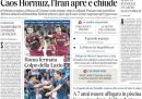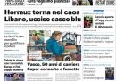 La notizia sulle prime pagine di tutti i principali quotidiani nazionali è la nuova chiusura dello stretto di Hormuz, annunciata dal presidente del parlamento iraniano Mohammad Bagher Ghalibaf, e motivata dal fatto che gli Stati Uniti avessero continuato a mantenere il blocco navale anche dopo l’annuncio iraniano della riapertura dello stretto, venerdì. L’altra notizia che trova spazio è l’uccisione di un soldato francese della missione di peacekeeping delle Nazioni Unite in Libano (Unifil) nel sud del Libano, nonostante il cessate il fuoco in vigore tra il governo libanese e Israele. Sulle prime pagine di alcuni giornali, non solo quelli sportivi, c’è anche il tennista italiano Flavio Cobolli, che sabato ha vinto la semifinale del torneo di Monaco di Baviera, in Germania, contro il tedesco Alexander Zverev.