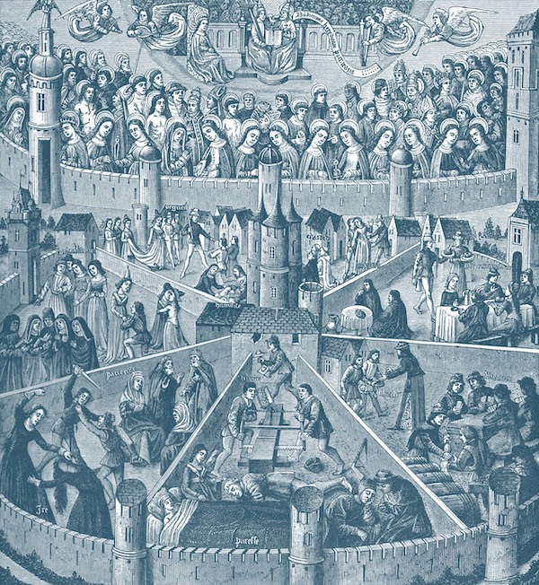 Una miniatura del XV secolo tratta dalla Città di Dio di Sant’Agostino. La sezione superiore rappresenta i santi accolti in cielo; le sette sezioni inferiori raffigurano coloro che si preparano alla salvezza attraverso le virtù cristiane oppure che se ne escludono commettendo i peccati capitali (Culture Club/Getty Images)