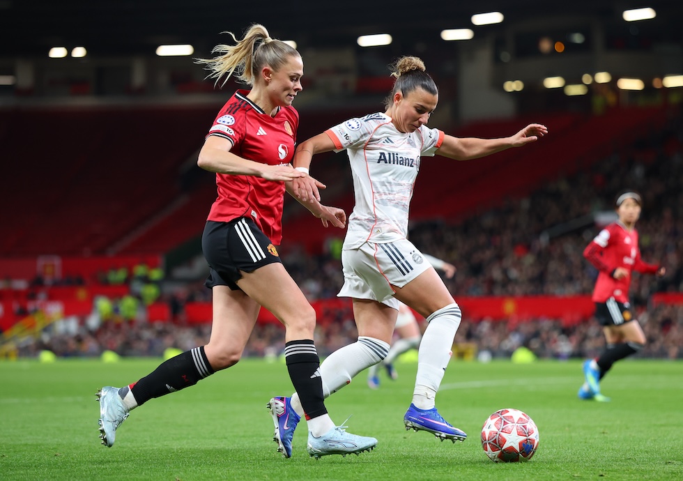 Arianna Caruso (a destra) a contrasto con Fridolina Rolfo durante Manchester United-Bayern Monaco (Molly Darlington/Getty Images)