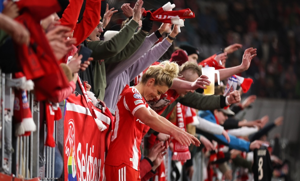Linda Dallmann esulta con i tifosi dell’Allianz Arena dopo la partita di Champions League contro il Manchester United (Stefan Matzke – sampics/Getty Images)
