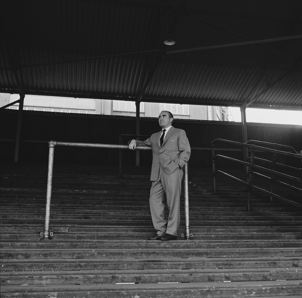 Alf Ramsey su una tribuna dello stadio Portman Road a Ipswich nel 1963 (Daily Express/Hulton Archive/Getty Images)