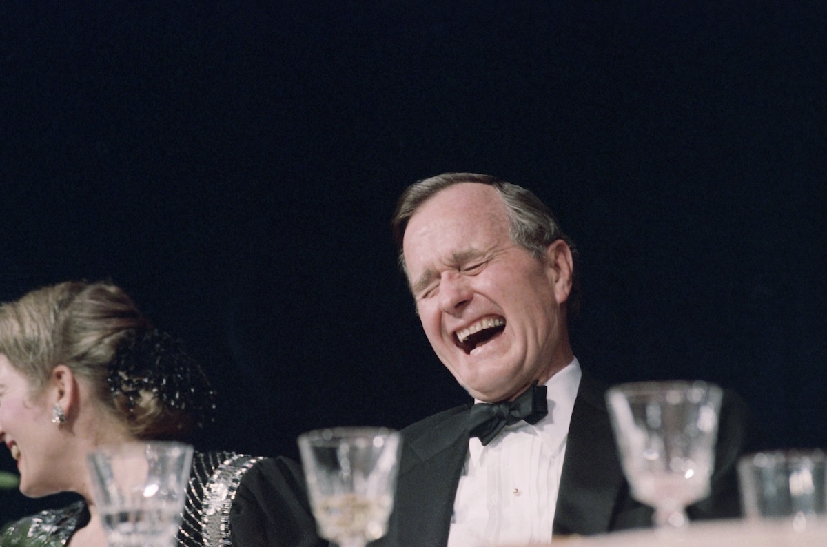 Il presidente George H. Bush, padre di George W. Bush, ride durante il monologo del comico Jim Morris alla cena del 1989 (AP Photo/J. Scott Applewhite)