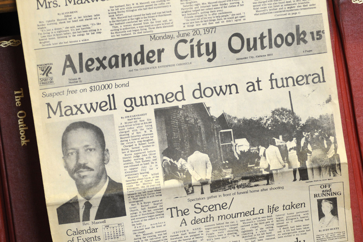 La prima pagina del quotidiano locale Alexander City Outlook dopo l’omicidio del reverendo Willie Maxwell nel 1977 (AP/Jay Reeves)