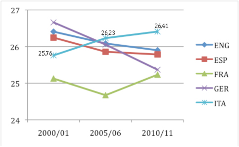 Tra le 5 leghe più importanti d’Europa la Serie A è oggi la più vecchia con un età media di quasi 27 anni, passando negli ultimi 10 anni dal penultimo posto al primo (Grafico 1).
