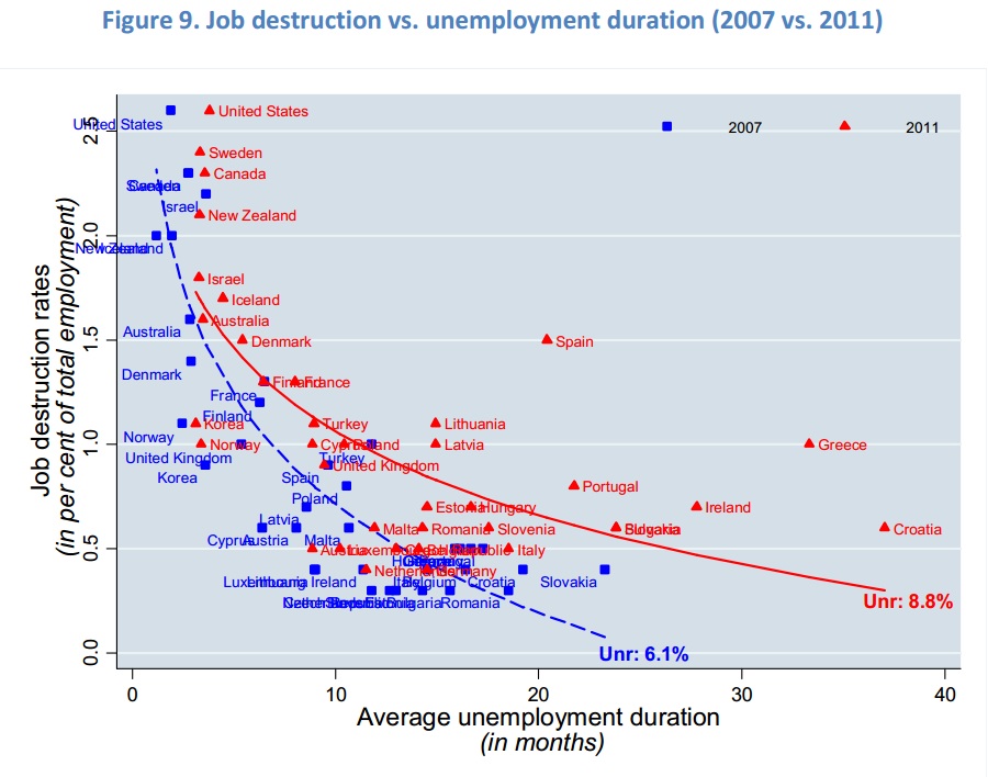 A queste ansie darebbe davvero sollievo un mercato del lavoro più rigido? Un mercato del lavoro più rigido rende più difficile, per esempio, il riassorbimento nel mercato del lavoro in caso di perdita dell’occupazione. Questo grafico pubblicato qualche tempo fa da Alphaville dell’FT rende l’idea, mostrando bene il trade off fra tutela dei “diritti” e facilità di ritrovare un posto di lavoro.