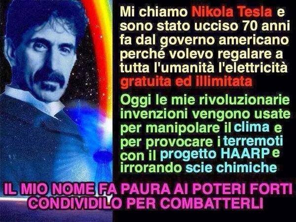 Qualche giorno fa sulla mia timeline Facebook è stata condivisa l’immagine qui sopra. Nei commenti gli amici ridevano per due motivi: il testo gombloddista scatenato (clima, terremoti, governo americano, HAARP, scie chimiche – non manca nulla) e la confusione di Nikola Tesla, definito profeta dell'”elettricità gratuita e illimitata”, con Frank Zappa, virtuoso della chitarra elettrica. L’immagine riunisce quindi due grandi classici moderni della rete: