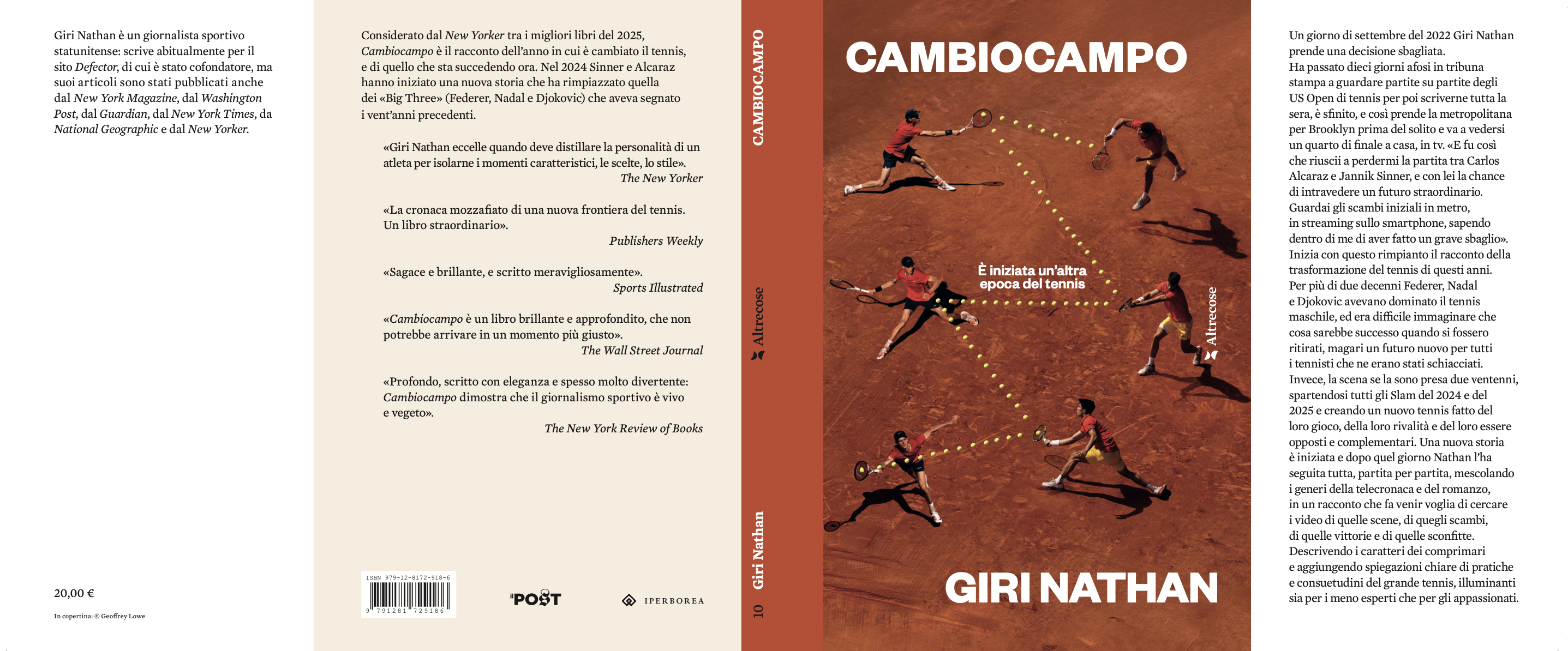 Giri Nathan è un giornalista sportivo statunitense. Scrive abitualmente per il sito Defector, di cui è stato cofondatore, ma suoi articoli sono stati pubblicati anche dal New York Magazine, dal Washington Post, dal Guardian, dal New York Times, dal National Geographic e dal New Yorker. La narrazione di Cambiocampo inizia da un momento preciso: la partita tra Sinner e Alcaraz ai quarti di finale maschili degli US Open del 2022, una partita così lunga e appassionante da far finire all’autore – letteralmente – l’inchiostro della penna. E da fargli capire che stava iniziando una nuova epoca del tennis: che ha deciso di raccontare con un libro.
