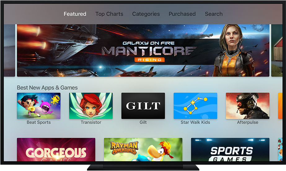 L’idea di tvOS è che tutto sia app, esattamente come succede su iOS. Questo vuol dire che c’è uno store per scaricare le app, che c’è modo di spostarle e organizzarle sullo schermo, mettendone alcune più in alto o in evidenza e spostandone altre meno usate verso il fondo, e che c’è un cartellino del prezzo su molti di questi pezzetti di software. Le app possono essere qualsiasi cosa: un giochino, una app per fare shopping online, una estensione di una app del telefono o del tablet, un canale televisivo di un fornitore di contenuti esterno (Netflix oppure la Rai Radiotelevisione italiana, per intenderci).