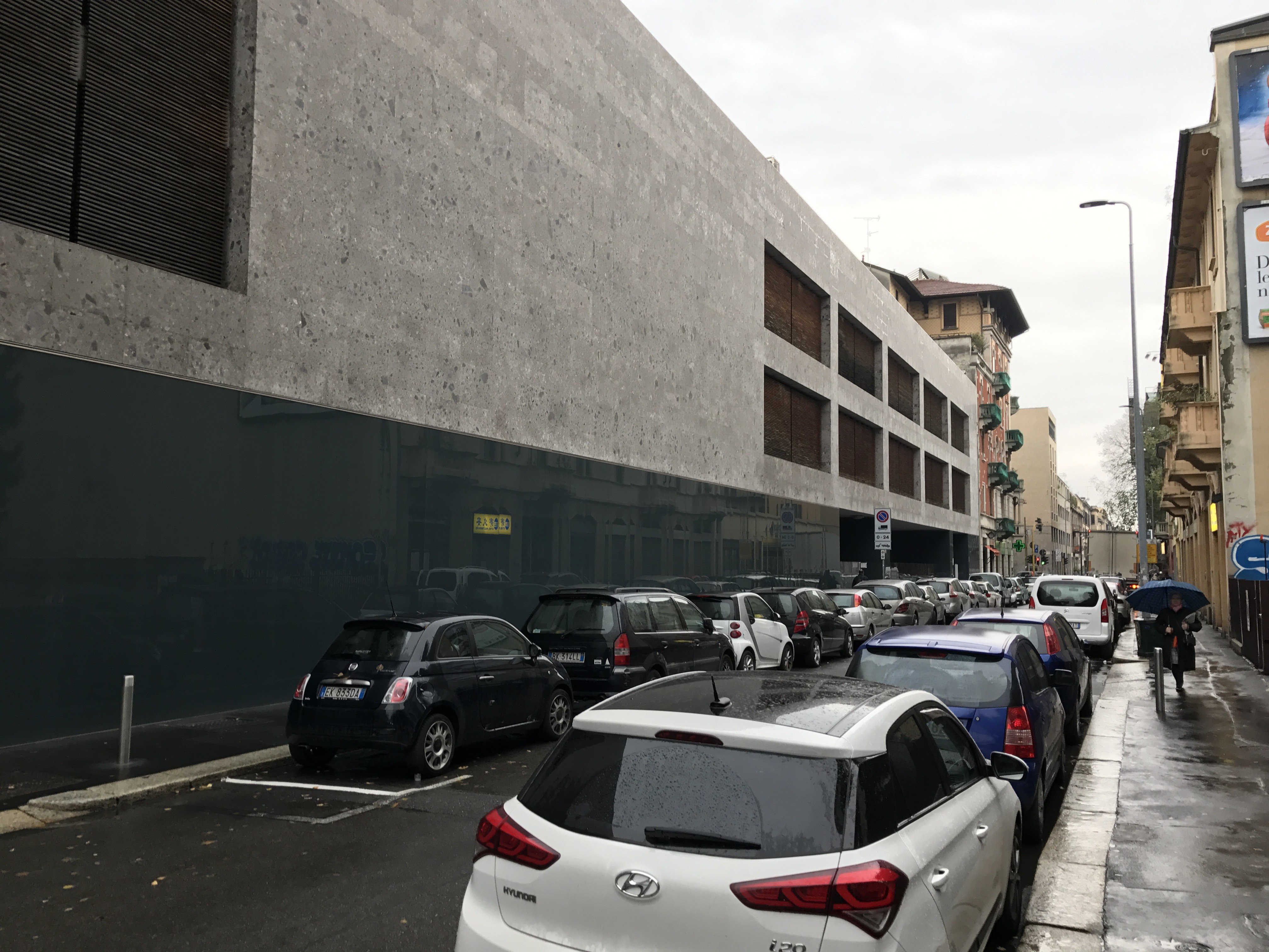 Il “muro del pianto” di via Lomazzo, a Milano. Qui una volta c’era la sede del Sole 24 Ore (che adesso è in via Monte Rosa). Al suo posto, un gigantesco parcheggio multipiano in cemento armato. Le abitazioni sono nascoste dietro. Un pugno negli occhi degli abitanti della strada