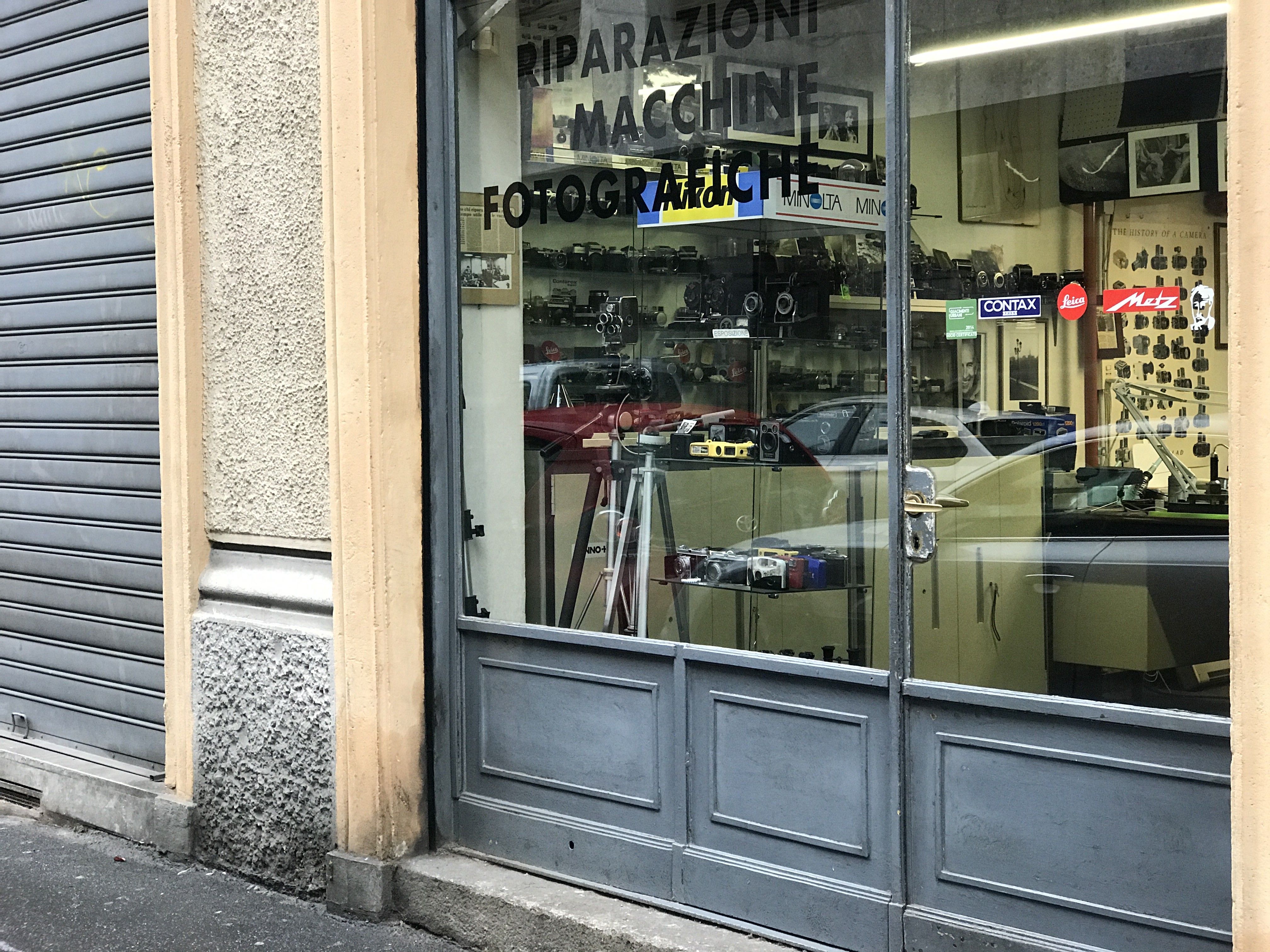La bottega di Gigi ha una sola luce, con in vetrina qualche rudere fotografico di tempi passati. All’entrata, il bancone di fronte, subito dietro il banco da lavoro e un altro tavolo, ai lati due vetrinette e scaffali in metallo. Dentro, il paradiso delle vecchie macchine fotografiche: dai banchi ottici alle vecchie medio formato, dalle 35 millimetri telemetro a quelle reflex. Con tutto quel che c’è nel mezzo. E poi, nascosti dietro il banco o dietro o sul soppalco, ci sono decine di scatole piene di pezzi e componenti, non solo per le riparazioni. C’è un accumulo ad esempio di tappi e coperchi, paraluci e tracolle che bastano per riempire eBay.