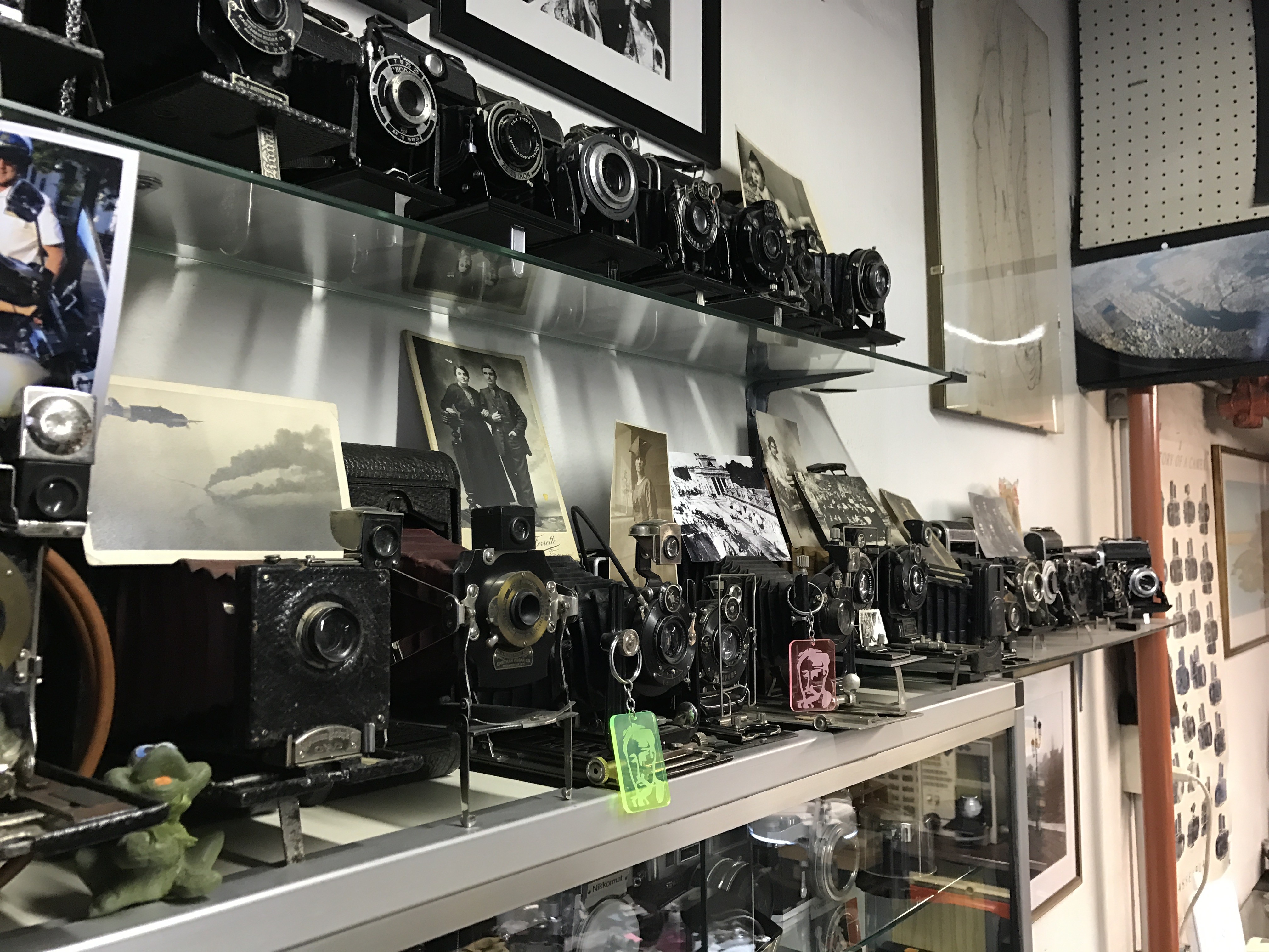 Una vista sulla sezione “vintage” delle macchine fotografiche esposte nel laboratorio di Gigi Carminati