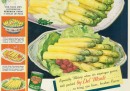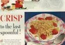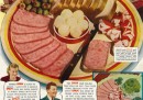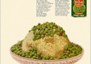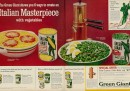 Un po’ di tempo fa mi sono imbattuta in questa bacheca Pinterest dedicata alle vecchie pubblicità sul cibo degli anni Cinquanta, Sessanta e Settanta. Si tratta soprattutto di annunci pubblicati su riviste femminili e ricettari statunitensi, che descrivono come prelibati piatti dall’aspetto non proprio appetitoso: insalate in gelatina, carne in scatola, tantissimi gusti di zuppa Campbell e improbabili ricette italiane che prevedono uova sode e piselli o pasta con mais e parmigiano.