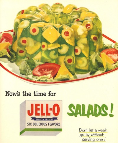 Un po’ di tempo fa mi sono imbattuta in questa bacheca Pinterest dedicata alle vecchie pubblicità sul cibo degli anni Cinquanta, Sessanta e Settanta. Si tratta soprattutto di annunci pubblicati su riviste femminili e ricettari statunitensi, che descrivono come prelibati piatti dall’aspetto non proprio appetitoso: insalate in gelatina, carne in scatola, tantissimi gusti di zuppa Campbell e improbabili ricette italiane che prevedono uova sode e piselli o pasta con mais e parmigiano.