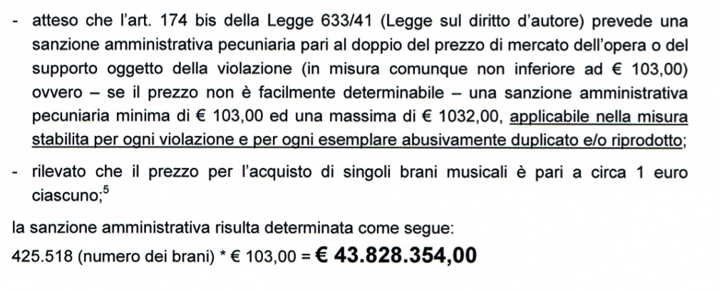Quarantatre milioni ottocentoventottomila trecentocinquantaquattro euro di multa per violazione dei diritti d’autore, anzi per la violazione dei diritti connessi al diritto d’autore, perchè dell’operazione beneficerà principalmente l’SCF Società Consortile Fonografici ovvero una delle associazioni di tutela dei produttori discografici.