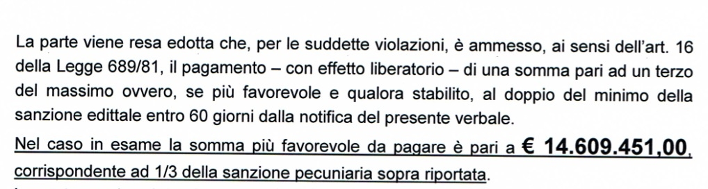 L’avviso che “La parte viene resa edotta che per le suddette violazioni è ammesso il pagamento – con effetto liberatorio- di una somma pari ad un terzo del massimo…” e cioè di soli 14 milioni e rotti è la parte che preferisco.