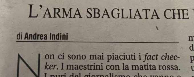 Il fact checker è un ruolo di storica importanza all’interno delle redazioni, connaturato alle funzioni stesse del giornalismo. Chi “controlla i fatti” ha la responsabilità di verifiche finali sugli articoli che vengono pubblicati: è un ruolo che è sempre stato raro nelle testate italiane (in parte interpretato da quelli che da noi sono detti “correttori”, destinati soprattutto a verifiche sulla forma) e che oggi è scomparso quasi del tutto, mentre diverse tra le più autorevoli testate internazionali ne mantengono funzioni e importanza. Queste funzioni sono molto preziose e negli scorsi decenni sono state spesso assunte da siti o esperti esterni a valle della pubblicazione, per supplire appunto a verifiche insufficienti all’interno di alcune redazioni. Proprio per la loro indiscutibile importanza, connaturata al giornalismo stesso, è interessante da segnalare la rivendicazione in senso opposto di un articolo di commento pubblicato sabato sul Giornale.