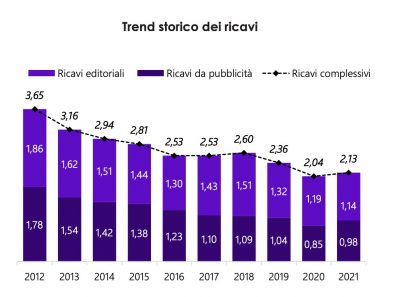 Quello qui sotto è invece l’andamento delle due maggiori categorie di ricavo, che generano il 70% del totale (interessante che la terza, quella dell’editoria libraria, rappresenti ben il 13,7% dei proventi per gli editori di giornali).