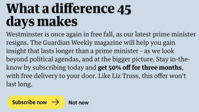 Le “complicate” vicende politiche del Regno Unito degli ultimi mesi hanno dato lo spunto al Guardian – uno dei maggiori quotidiani del paese, e uno dei maggiori siti di news mondiali – di declinare i suoi abituali inviti ad abbonarsi online (il Guardian non ha paywall, e raccoglie libere offerte o abbonamenti) intorno ai temi dell’attualità: mettendo in relazione le notizie al lavoro del giornale e alla sua sostenibilità. Gli sviluppi hanno poi dato un’occasione ancora più puntuale e dedicata quando una ministra del governo Truss (poi costretta alle dimissioni e reintegrata nel governo Sunak) ha preso in giro gli elettori progressisti e i lettori del Guardian stesso: che ne ha approfittato .