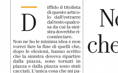 Una piccola ma preziosa consapevolezza su come vengono fatti i giornali che Charlie ha cercato spesso di diffondere presso i lettori è stata sottolineata esplicitamente in un articolo di Giacomo Papi su Repubblica , lunedì: ovvero il fatto che i titoli degli articoli siano preparati nelle redazioni senza coinvolgere gli autori degli articoli. Papi ha ritenuto di premunirsi rispetto all’eventualità che al suo articolo venisse assegnato un titolo pigro e rituale a proposito dei problemi della sinistra italiana.