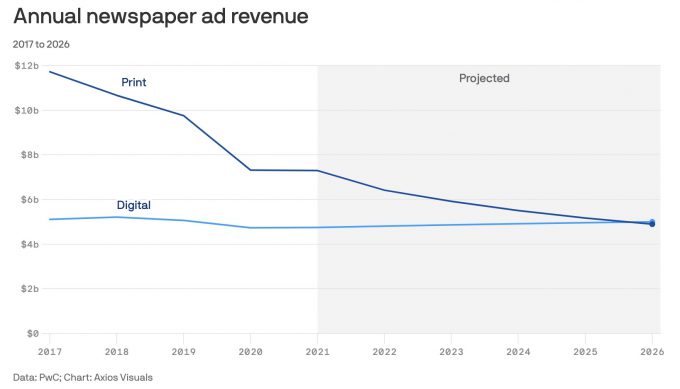 Nei giorni scorsi è tornato a circolare tra alcuni account che si occupano di informazione un grafico pubblicato l’anno scorso dal sito Axios, che è utile per avere il quadro delle prospettive dei ricavi pubblicitari dei giornali e per capire perché lo spostare le priorità sugli abbonamenti è diventato indispensabile per tutte le aziende giornalistiche. Il grafico illustrava una delle brevi news di Axios, con il rassicurante titolo di “Negli Stati Uniti i ricavi pubblicitari digitali supereranno quelli della carta nel 2026”. Ma la formulazione era un po’ equivoca, a guardare l’illuminante grafico: la ragione del sorpasso ipotizzato è infatti il crollo dei ricavi sulla carta che scenderebbe sotto quello – stabile, praticamente fermo – dei ricavi dal digitale. La pubblicità online, insomma, non ha prospettive di compensare il declino di quella sulla carta (per molte ragioni: maggiore concorrenza di spazi e contenitori, minor valore delle inserzioni, concorrenza delle piattaforme): e per questo i giornali hanno bisogno di tornare a investire sui rapporti con i lettori molto più che su quelli con gli inserzionisti.