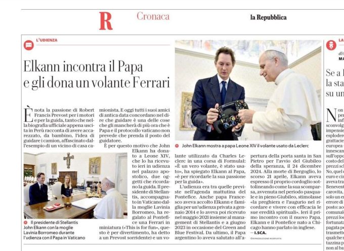 “Il presidente di Stellantis, accompagnato in Vaticano dalla moglie Lavinia Borromeo, ha regalato al Pontefice una Ferrari in miniatura («This is for fun», questo è per divertimento, ha detto a un Prevost sorridente) e un volante utilizzato da Charles Leclerc in una corsa di Formula1: «È un vero volante, è stato usato », ha spiegato Elkann al Papa, «è per ricordarle la sua passione per la guida».