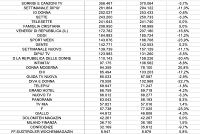 Questi sono i dati di diffusione comunicati per il mese di novembre 2023 dai settimanali italiani iscritti al sistema di certificazione ADS. Nella seconda colonna ci sono gli stessi dati relativi a giugno (quelli più coerenti con cui fare un confronto a distanza), e nella terza la variazione percentuale in questi cinque mesi. Sono dati di diffusione “grossolana” che comprendono anche le copie promozionali e omaggio (53mila per Sportweek, 30mila e 8mila per Donna Moderna e Panorama del gruppo editoriale del quotidiano La Verità: quasi tutte copie digitali), quelle a prezzi scontatissimi (50mila ciascuno per Sette e IoDonna ) o quelle vendute in quantità “multiple” ad aziende o istituzioni. Naturalmente alcuni settimanali beneficiano rispetto ad altri dell’essere venduti allegati a un quotidiano.