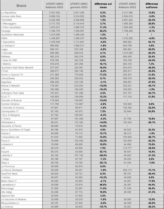 Per alcune delle testate nelle prime posizioni ricordiamo che bisogna considerare che i numeri possono includere anche quelli di vere e proprie “sottotestate” con una loro autonomia: il sito di divulgazione tecnologica di Salvatore Aranzulla, per esempio, ha 272mila visitatori unici nelle ultime rilevazioni, contati nel totale del Messaggero; nei numeri del Corriere della Sera sono incluse quote di utenti che non necessariamente hanno visitato il sito del Corriere della Sera ma possono riferirsi ai soli siti di testate dello stesso editore come Oggi (108mila), Amica (47mila) e IoDonna (140mila); Repubblica ottiene ben 243mila utenti dal sito AlFemminile e 157mila da MyMovies; il Secolo XIX aggiunge i suoi 56mila utenti a quelli della Stampa. Mentre sotto la dizione “Quotidiani Gedi News Network” sono sommati i siti dei quotidiani locali del gruppo Gedi (primi nel traffico sono Mattino di Padova e Messaggero Veneto di Udine, con circa 45mila utenti); e anche Quotidiano Nazionale aggrega i tre quotidiani locali Resto del Carlino (293mila), Nazione (261mila) e Giorno (260mila).
