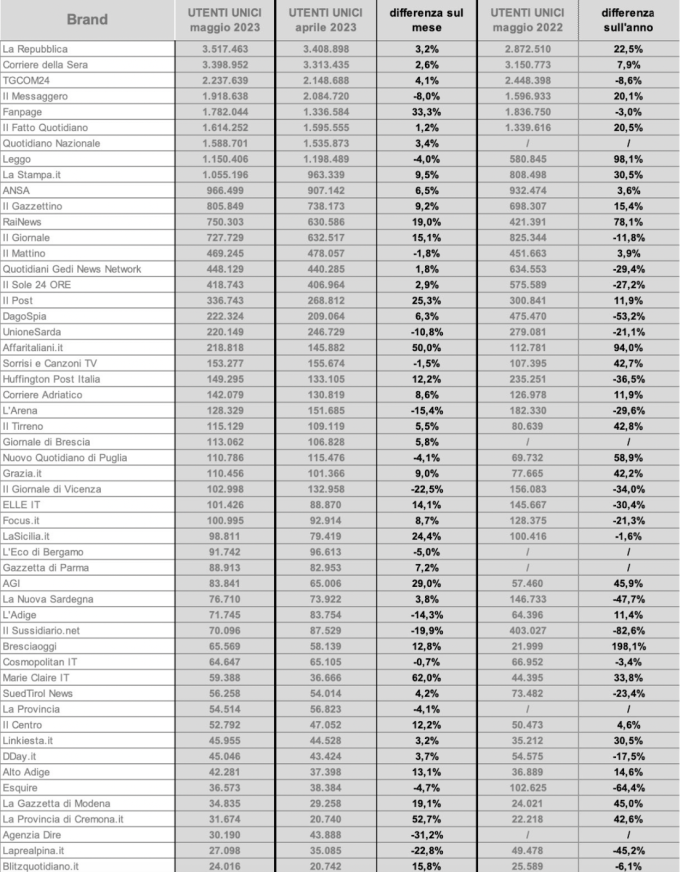 Per alcune delle testate nelle prime posizioni ricordiamo che bisogna considerare che i numeri possono includere anche quelli di vere e proprie “sottotestate” con una loro autonomia (su cui il gruppo GEDI sta per esempio intensificando un’operazione di acquisizioni), come abbiamo spiegato altre volte.