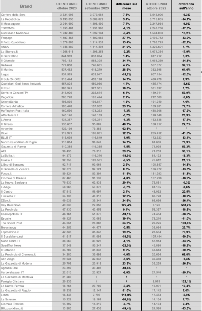 Per alcune delle testate nelle prime posizioni ricordiamo che bisogna considerare che i numeri possono includere anche quelli di vere e proprie “sottotestate” con una loro autonomia (su cui il gruppo GEDI sta per esempio intensificando un’operazione di acquisizioni: il secondo apporto più importante ai numeri presentati come di Repubblica è il sito MyMovies, seguito da Ticonsiglio; i numeri del sito del Corriere comprendono anche quelli di IoDonna e di Oggi), come abbiamo spiegato altre volte.