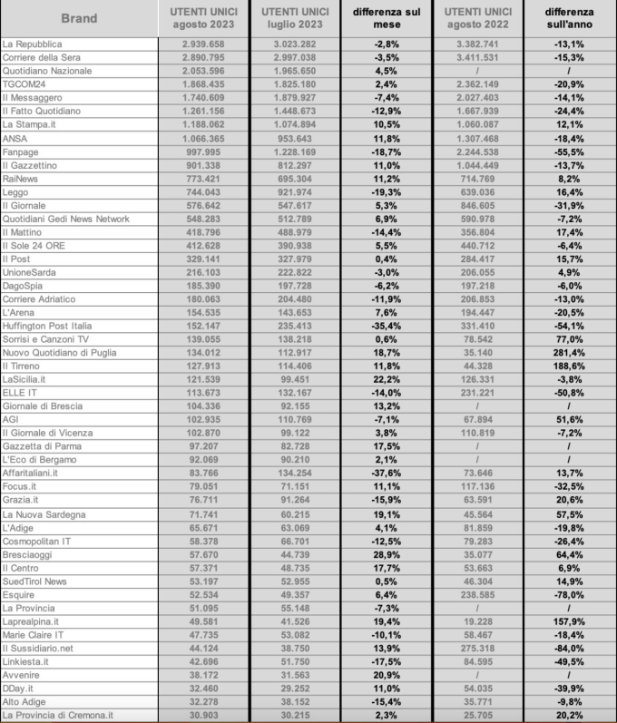 Per alcune delle testate nelle prime posizioni ricordiamo che bisogna considerare che i numeri possono includere anche quelli di vere e proprie “sottotestate” con una loro autonomia (su cui il gruppo GEDI sta per esempio intensificando un’operazione di acquisizioni: il secondo apporto più importante ai numeri presentati come di Repubblica è il sito Ticonsiglio.it), come abbiamo spiegato altre volte.