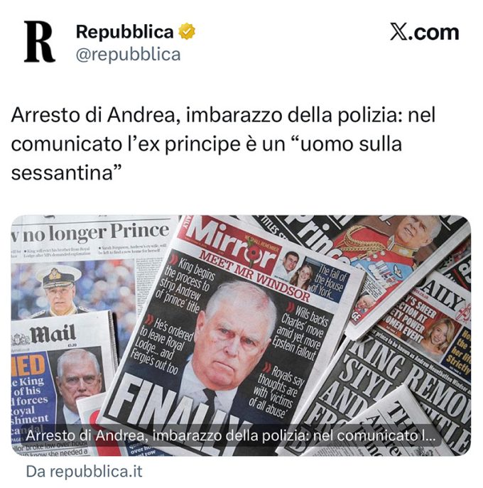 In questa newsletter abbiamo ricordato spesso le frequenti limitazioni alla diffusione di informazioni su indagini e processi in corso che sono previste e applicate dai sistemi giuridici di altri paesi, e in particolare nel Regno Unito. La loro mancata conoscenza ha generato un’ipotesi complottista in un titolo e un articolo di Repubblica sull’arresto dell’ex principe Andrew Mountbatten-Windsor, giovedì. Nel Regno Unito, infatti, la polizia non comunica l’identità di persone arrestate fino a che non ci sia una formale incriminazione, salvo specifiche ragioni di pericolo. Era quindi ordinaria amministrazione che – pur essendo chiaro cosa fosse avvenuto – inizialmente l’arresto fosse stato riportato come quello di “a man in his sixties”.