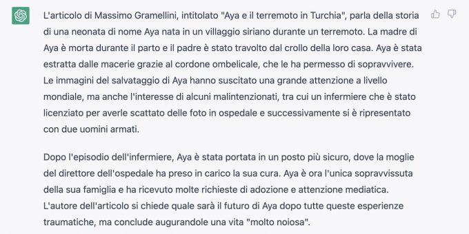 Di questa cosa cominciano a rendersi conto alcune aziende giornalistiche, che stanno cercando di correre ai ripari: e la questione ha qualcosa in comune con il confronto che ha opposto in questi anni – e oppone tuttora – i giornali e Google sull’uso degli “snippet” dei giornali sulle pagine di Google. Dal Wall Street Journal e da CNN hanno intanto cominciato a protestare per l’utilizzo dei propri contenuti al fine di arricchire l’addestramento di ChatGPT: «Chiunque voglia usare il lavoro dei giornalisti del Wall Street Journal per addestrare l’intelligenza artificiale deve ottenerne regolare licenza da parte di Dow Jones», dicono da Dow Jones, editore del Wall Street Journal. È stata la stessa ChatGPT, interrogata, a confessare la lista delle sue fonti (anche italiane).