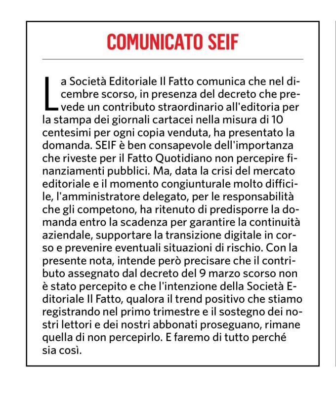 La società editrice del Fatto Quotidiano, SEIF, ha pubblicato sabato sul giornale un comunicato dal testo piuttosto involuto per informare i lettori, a distanza di tre mesi, di avere fatto richiesta di un finanziamento pubblico straordinario per i giornali cartacei, contraddicendo la storica e simbolica formulazione che compare sotto la testata del giornale, “Non riceve alcun finanziamento pubblico”. Il testo prosegue aggiungendo che dal momento che quel finanziamento non è ancora stato erogato (l’accoglimento della richiesta è in effetti di solo una settimana fa), la società non esclude di rinunciarci se “il trend positivo” attuale dovesse proseguire. La richiesta del finanziamento pubblico presentata a dicembre è oggi spiegata con la necessità di “garantire la continuità aziendale” e “prevenire eventuali situazioni di rischio”, formulazioni che suggeriscono qualche preoccupazione (il contributo si riferisce alla diffusione nel 2023, e corrisponde a 721mila euro netti).