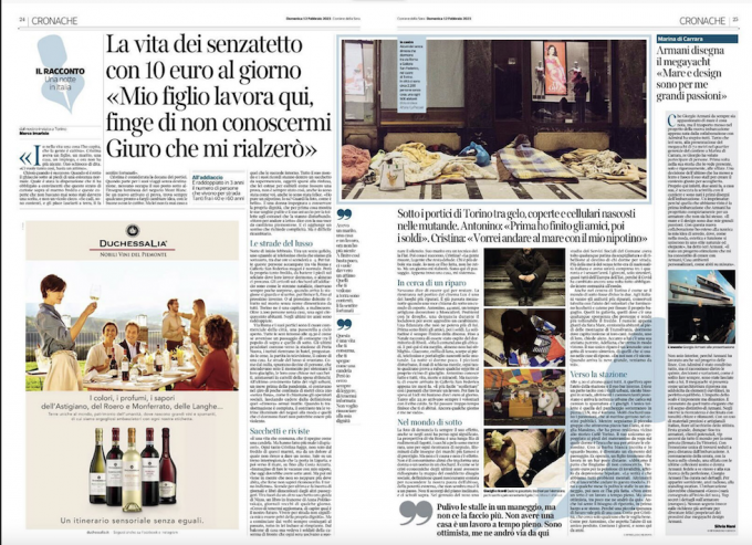 Sul Corriere della Sera di oggi, domenica, quasi due pagine sono occupate da un bell’articolo non retorico di Marco Imarisio sulle condizioni dei tanti senzatetto che dormono sotto i portici del centro di Torino. Ma nello spazio rimanente della doppia pagina – una colonna – è stato inserito un articolo dedicato al “megayacht” disegnato da Giorgio Armani, e il contrasto fa impressione. Di solito a queste cose si fa attenzione, nelle redazioni (Armani è un importante inserzionista, anche in questi giorni), ma se invece è stata una scelta l’effetto dà in effetti da pensare ai lettori.