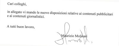 Il direttore di Repubblica, Maurizio Molinari, ha risposto alla richiesta di maggiori garanzie di autonomia dalle pressioni della pubblicità che la redazione aveva espresso in una sorta di decalogo il mese scorso. La risposta di Molinari è al tempo stesso perentoria nell’accettare le richieste e sfuggente nel definire delle regole, descritte con formulazioni molto fumose e che lasciano zone grigie e discrezionalità. Permettendo, per esempio, questa doppia pagina di promozione della comunicazione di ENI, uscita su Repubblica giovedì senza nessuna indicazione della sua natura pubblicitaria; oppure un articolo di promozione di un’iniziativa del brand di abbigliamento Paul & Shark pochi giorni prima di una pagina pubblicitaria di Paul & Shark.