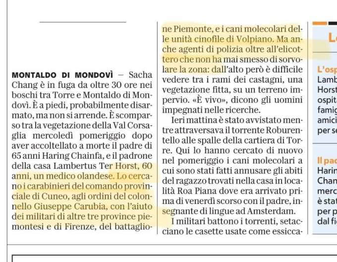 (poche ore dopo la persona in questione è stata arrestata con grande ridimensionamento del pericolo e lo stesso giornale non ne ha dato notizia l’indomani)