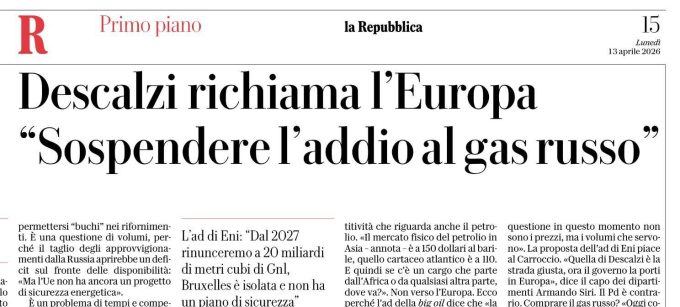“È l’ora della risposta «straordinaria». Perché «eccezionale» è lo shock energetico provocato dal blocco dello Stretto di Hormuz, «il più importante degli ultimi quarant’anni». E perché la tregua – aggiunge l’ad di Eni Claudio Descalzi – «non è mai esistita». Ecco il tabù da rompere: il gas russo. Dal palco della scuola di formazione politica della Lega, che da giorni preme per comprare metano e petrolio da Putin, il ceo del colosso dell’energia indica una via d’uscita, di fatto obbligata, all’Europa che «si sta sempre più isolando». Così: «Penso che sia necessario sospendere il ban (divieto) che scatterà il primo gennaio 2027 sui venti miliardi di metri cubi di gnl (gas naturale liquefatto) che vengono dalla Russia»”.