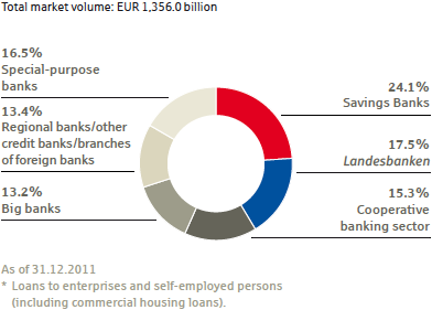 La KfW, come dice Tremonti, è effettivamente un gruppo bancario pubblico, simile per certi versi all’italiana Cassa Depositi e Prestiti. La cosa che più interessa a Tremonti è che una branca della KfW si occupa direttamente di fornire prestiti alle piccole e medie imprese – una cosa che in modi tortuosi e complessi e sempre per pochi spiccioli, fa anche la CDP italiana. Anche in Germania, al contrario di quanto sostiene Tremonti, la KfW non è proprio dotata di risorse sterminate: nel 2011 aveva in essere circa 70 miliardi di euro in prestiti, di cui 22 alle piccole e medie imprese. Lo schema che vedete qui sotto rappresenta l’intero mercato tedesco dei prestiti alle imprese tedesche nel 2011.