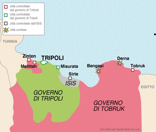 Mellitah è un luogo dove gli interessi italiani in Libia si incrociano con l’anarchia che regna nel paese. Da qui lunedì 20 luglio sono stati rapiti quattro tecnici italiani e sempre da qui parte il gasdotto Greenstream che dopo aver percorso cinquecento chilometri sul fondo del Mediterraneo arriva a Gela, in Sicilia. A ottanta chilometri da Mellitah c’è Tripoli, dove ha sede il governo degli islamisti che controlla la parte occidentale del paese. Poco lontano c’è Zintan, un’enclave da dove il governo rivale di Tobruk lancia i suoi attacchi contro gli islamisti. Intorno all’impianto, come in gran parte della Libia, imperversano bande armate che obbediscono soltanto ai loro leader ed è probabile che proprio una di queste abbia rapito i quattro tecnici. La Libia non si trova ancora in una situazione disperata come la Siria o l’Iraq, ma è oramai divenuta uno stato fallito dove sono le bande armate a imporre la legge: milizie tuareg nel sud del paese, gruppi armati tribali nelle aree costiere e formazioni affiliate ad al Qaida nelle grandi città. E poi c’è l’ISIS.