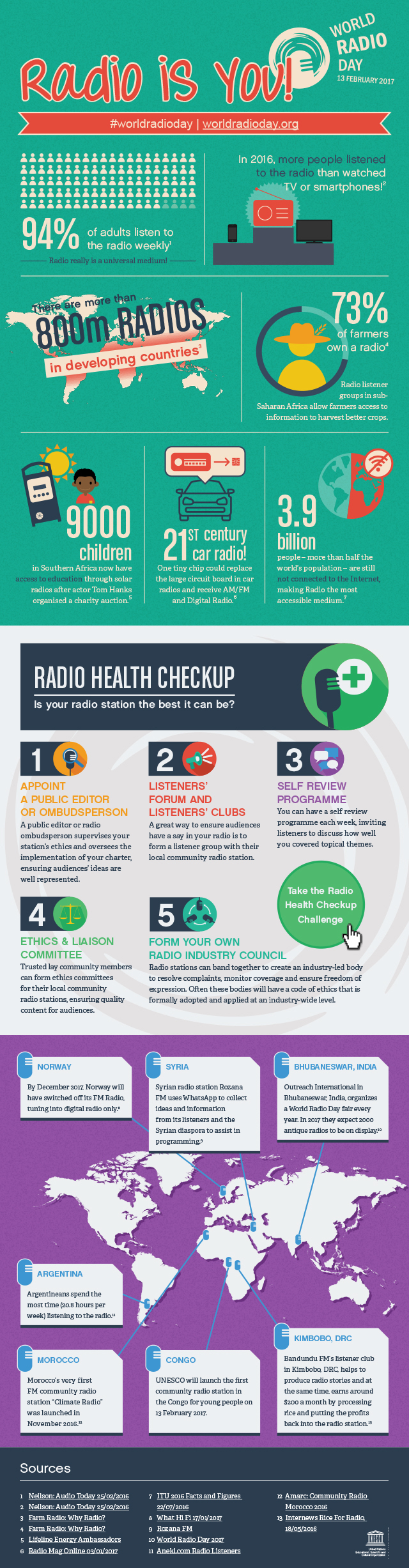 L’Unesco ha proclamato il 13 febbraio il #WorldRadioDay, la Giornata Mondiale della Radio, la festa delle radio di tutto il mondo, con più di 500 eventi in più di 100 Paesi. Non è banale ricordare l’importanza della radio perché spesso ci dimentichiamo che è il mass media più utilizzato al mondo: in una settimana raggiunge il 94% degli adulti americani e nel 2016 sono state molte di più le persone che hanno acceso la radio di quante abbiano guardato la tv. Certo, una radio costa molto meno di un televisore e questo nelle zone più povere del pianeta fa la differenza, ma se consideriamo che sono più di 800 milioni le radio nei paesi in via di sviluppo, allora è facile comprendere quanto la radio svolga un ruolo d’informazione e cultura fondamentale per le popolazioni locali e per paesi interi, visto che 3,9 miliardi di persone ancora non hanno accesso a internet.