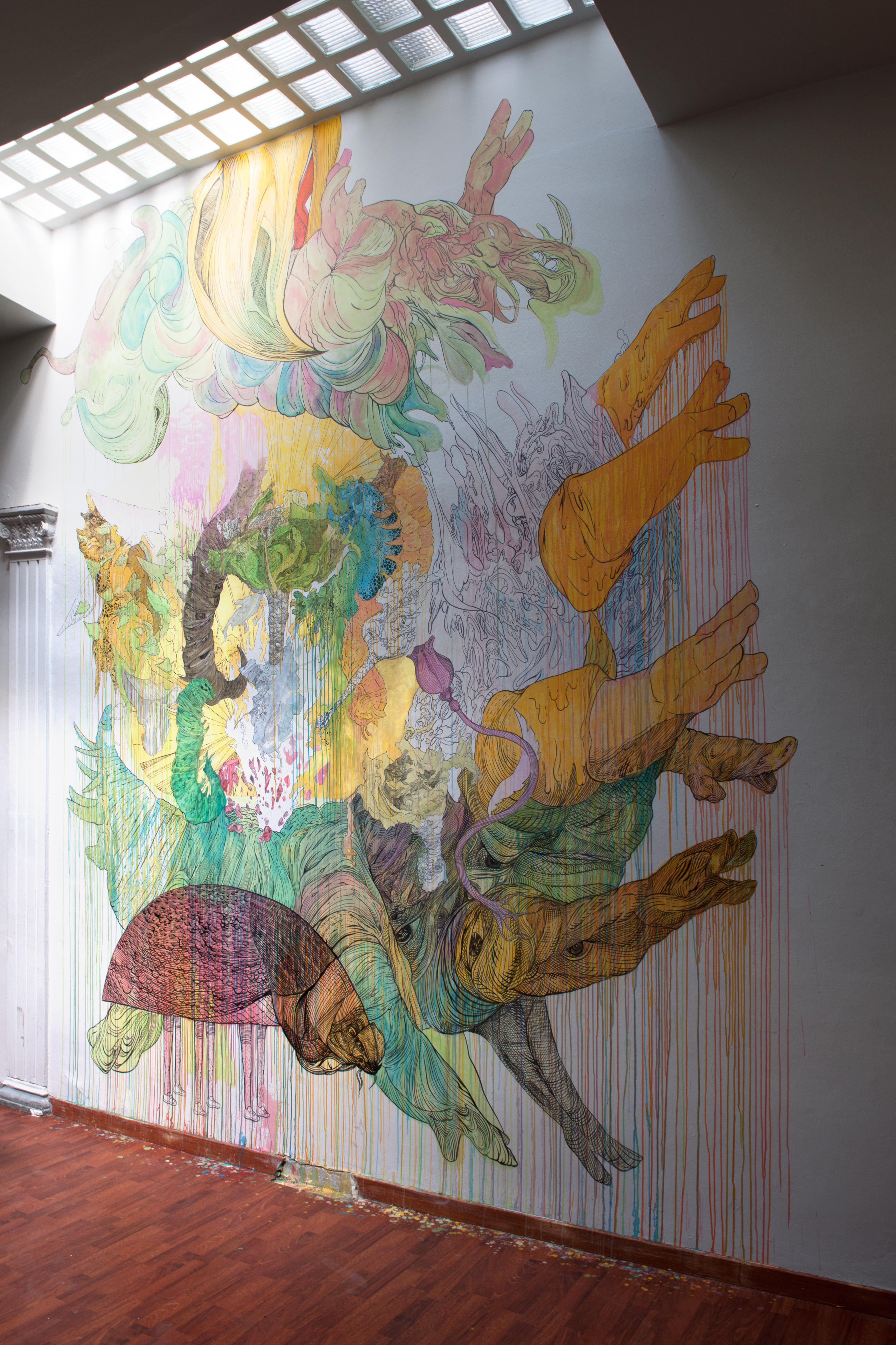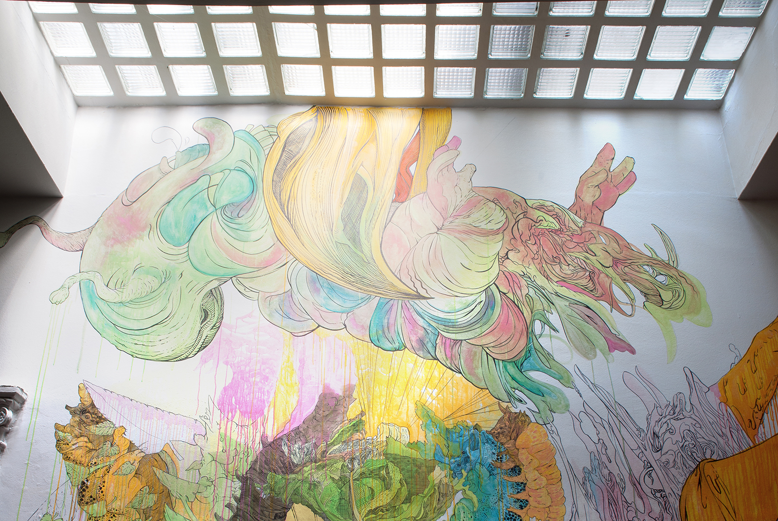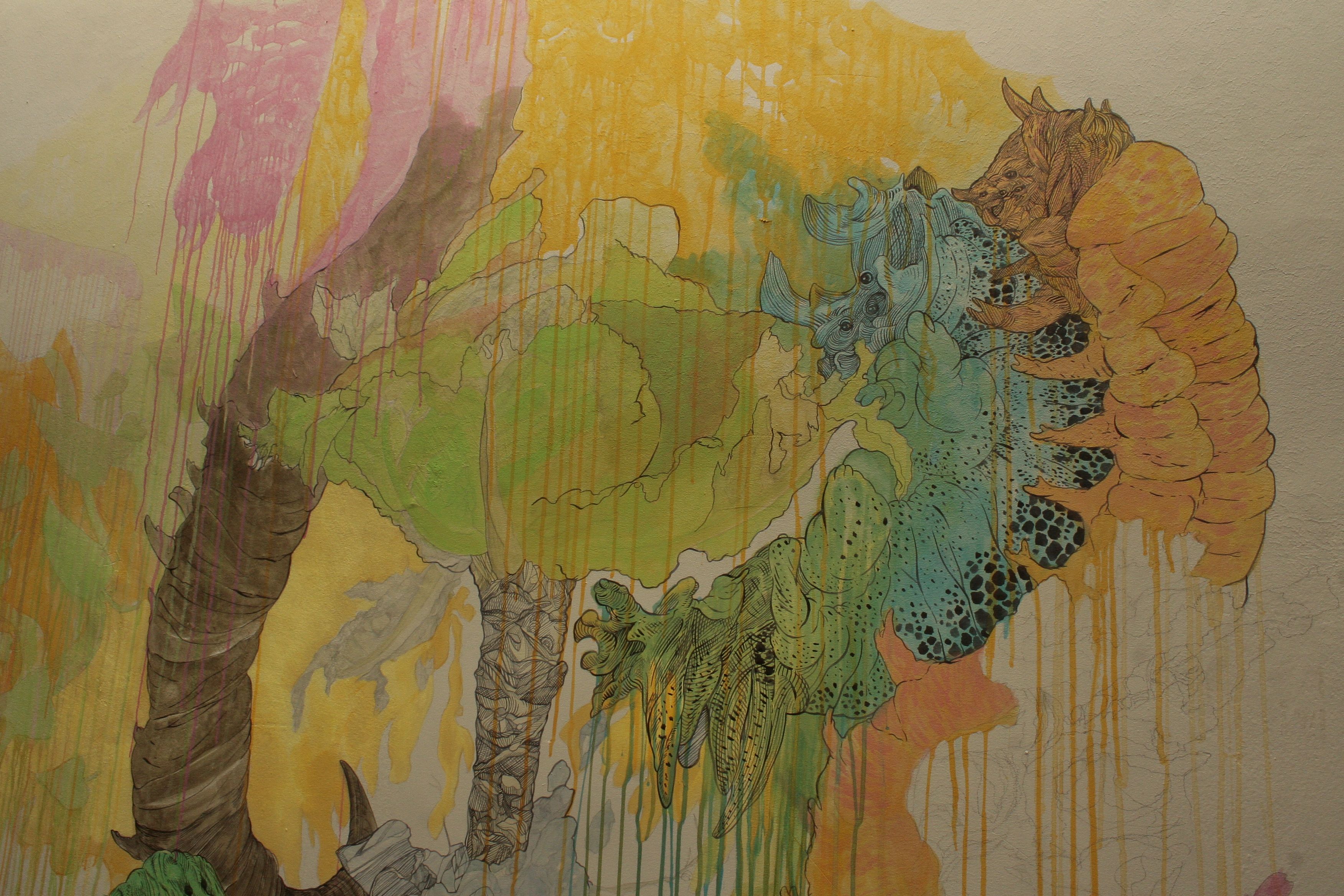su un muro, con uno scarafaggio a sei zampe a cui mi sono scordato di disegnare le braccia che non ci stava nelle foto precedenti. A colori, no dico: a colori. Che mica li uso così volentieri i colori che poi rubano l’anima mi dicevano. Dopo una media di cinque caffè e tre tè verdi al giorno per otto giorni non stop che i primi due giorni mi ci sono voluti per capire come si disegna su un muro a colori. In un circolo che ha aperto i battenti da un paio di settimane per combattere la vivace desertificazione culturale della città di Reggio Emilia di cui sposo felicemente la causa. Che si chiama Dinamo; il circolo dico, si chiama DINAMO, pare tutto maiuscolo. Le foto della costruzione del lavoro le ha fatte il Dorian Paderni che una sera mentre ero su una scala durante un concerto mi dice – ti faccio due foto e da lì in poi ha documentato l’intero lavoro. Che ce ne fossero di Dorian Paderni dico, che io mica lo conoscevo prima Dorian Paderni ma pazientemente ha fatto foto pure la domenica mattina. Che ce ne fosse di gente che apre circoli culturali per offrire un luogo contro la desertificazione culturale e persone che fanno foto la domenica mattina.