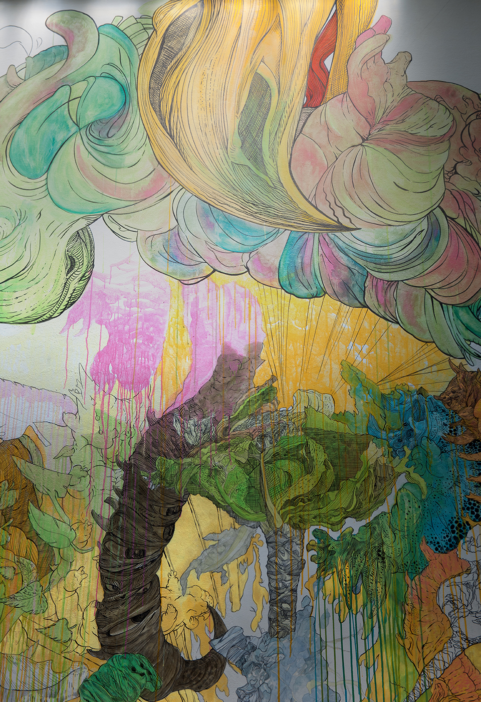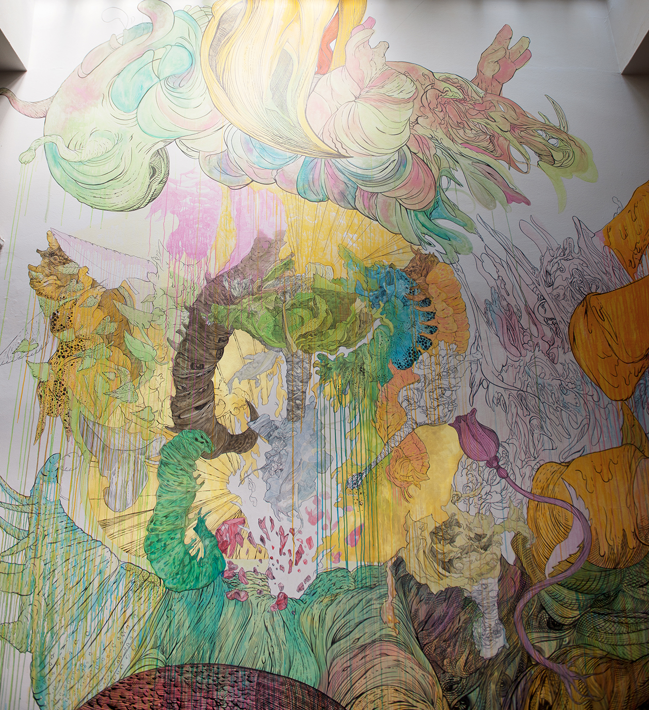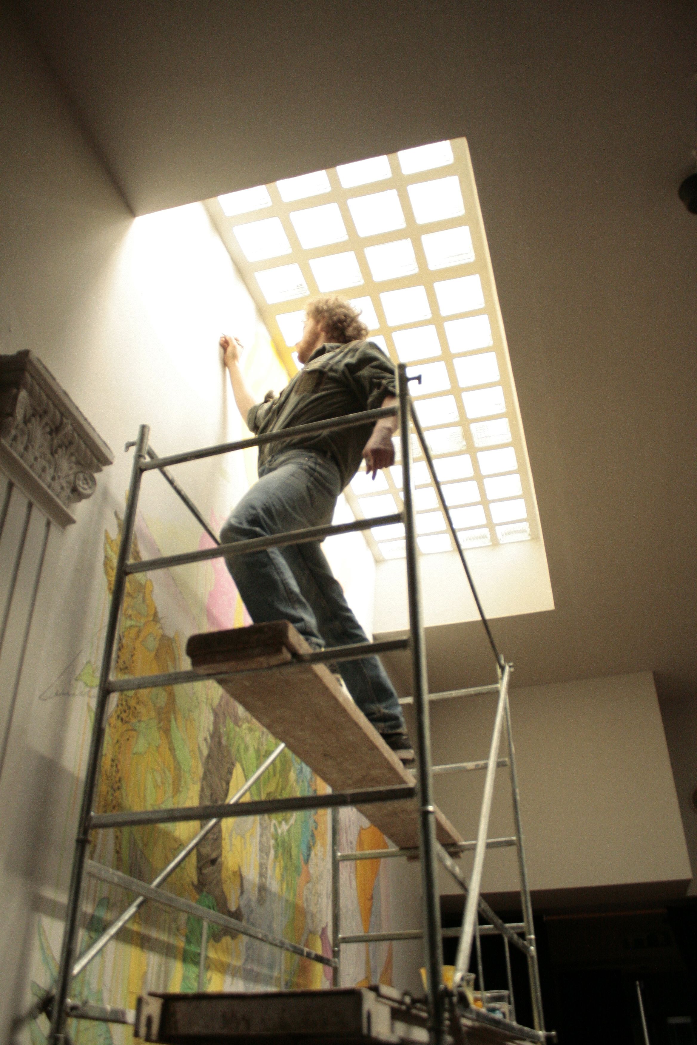 su un muro, con uno scarafaggio a sei zampe a cui mi sono scordato di disegnare le braccia che non ci stava nelle foto precedenti. A colori, no dico: a colori. Che mica li uso così volentieri i colori che poi rubano l’anima mi dicevano. Dopo una media di cinque caffè e tre tè verdi al giorno per otto giorni non stop che i primi due giorni mi ci sono voluti per capire come si disegna su un muro a colori. In un circolo che ha aperto i battenti da un paio di settimane per combattere la vivace desertificazione culturale della città di Reggio Emilia di cui sposo felicemente la causa. Che si chiama Dinamo; il circolo dico, si chiama DINAMO, pare tutto maiuscolo. Le foto della costruzione del lavoro le ha fatte il Dorian Paderni che una sera mentre ero su una scala durante un concerto mi dice – ti faccio due foto e da lì in poi ha documentato l’intero lavoro. Che ce ne fossero di Dorian Paderni dico, che io mica lo conoscevo prima Dorian Paderni ma pazientemente ha fatto foto pure la domenica mattina. Che ce ne fosse di gente che apre circoli culturali per offrire un luogo contro la desertificazione culturale e persone che fanno foto la domenica mattina.