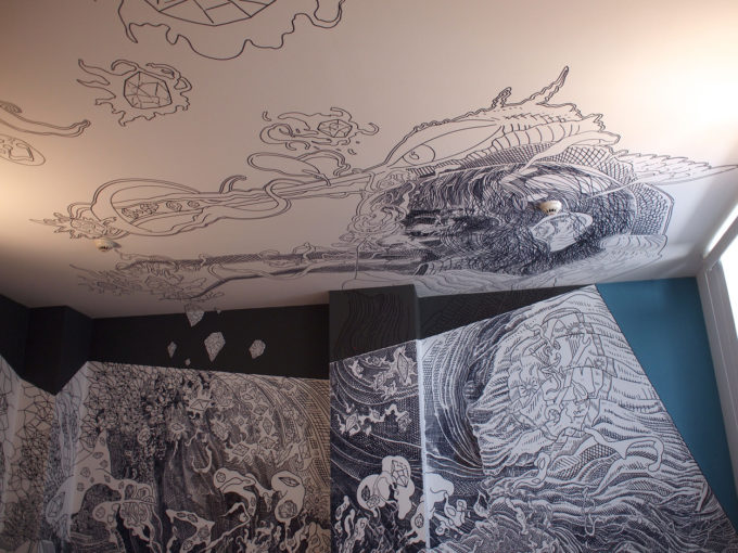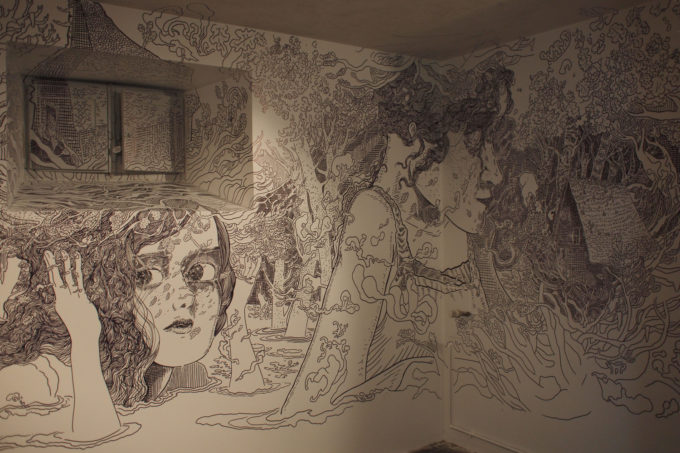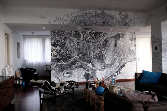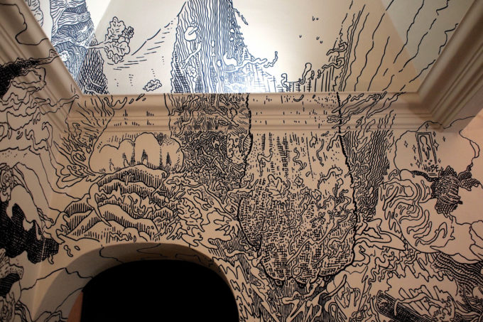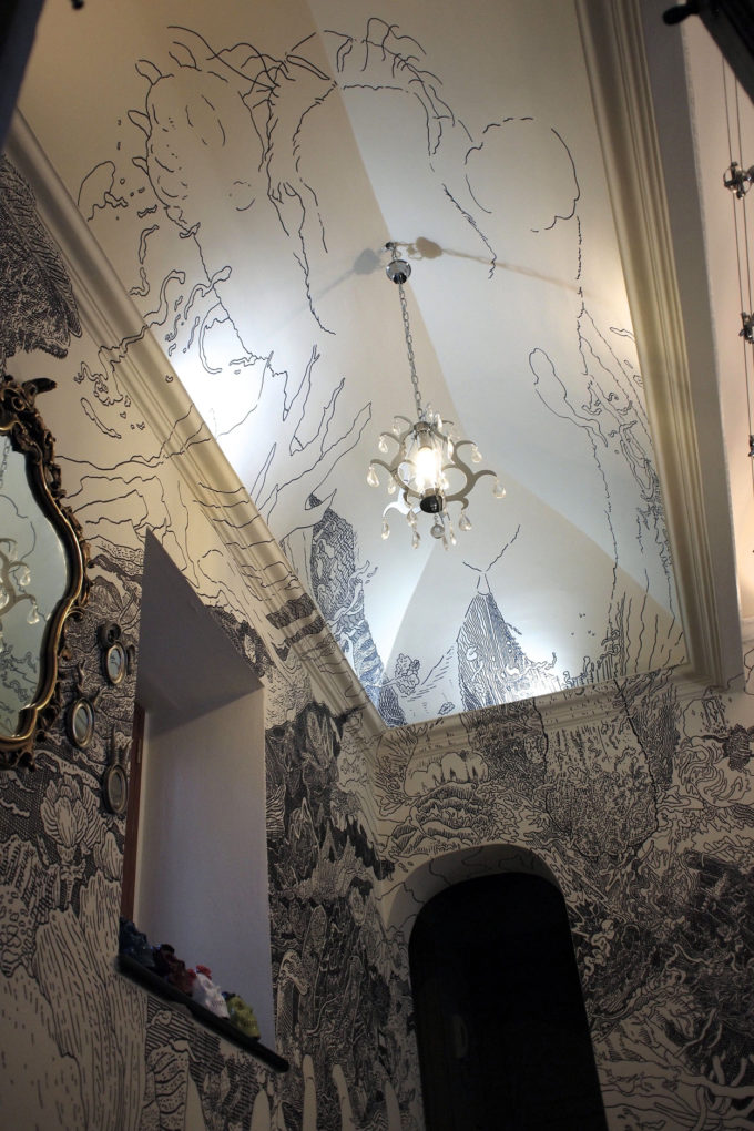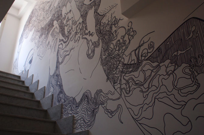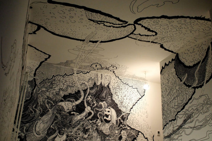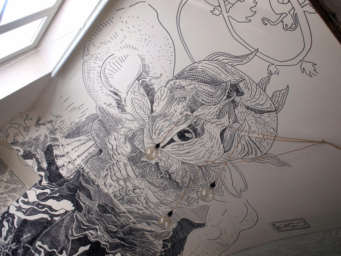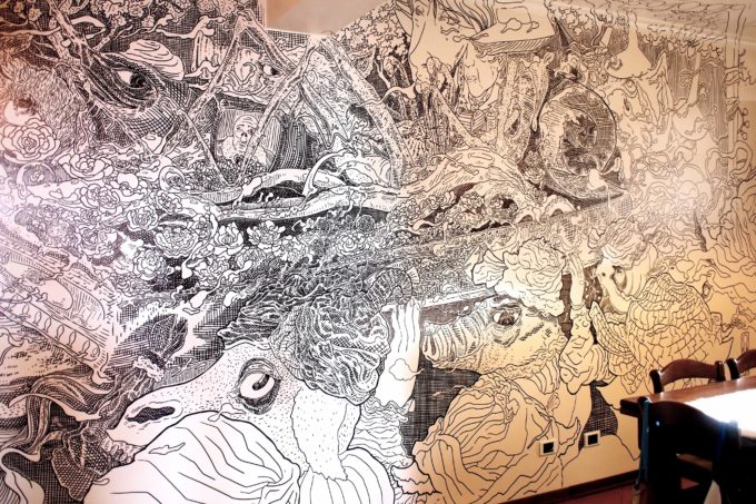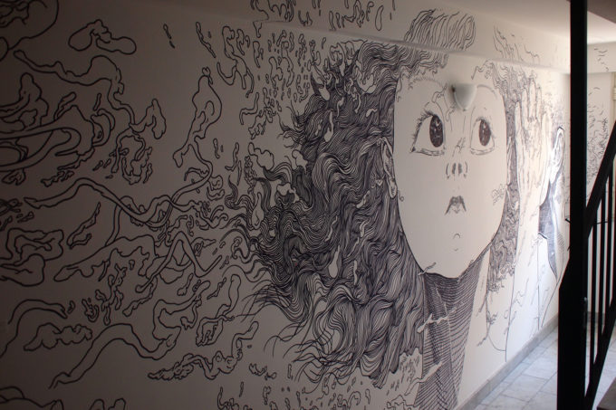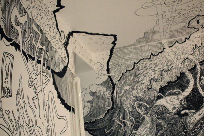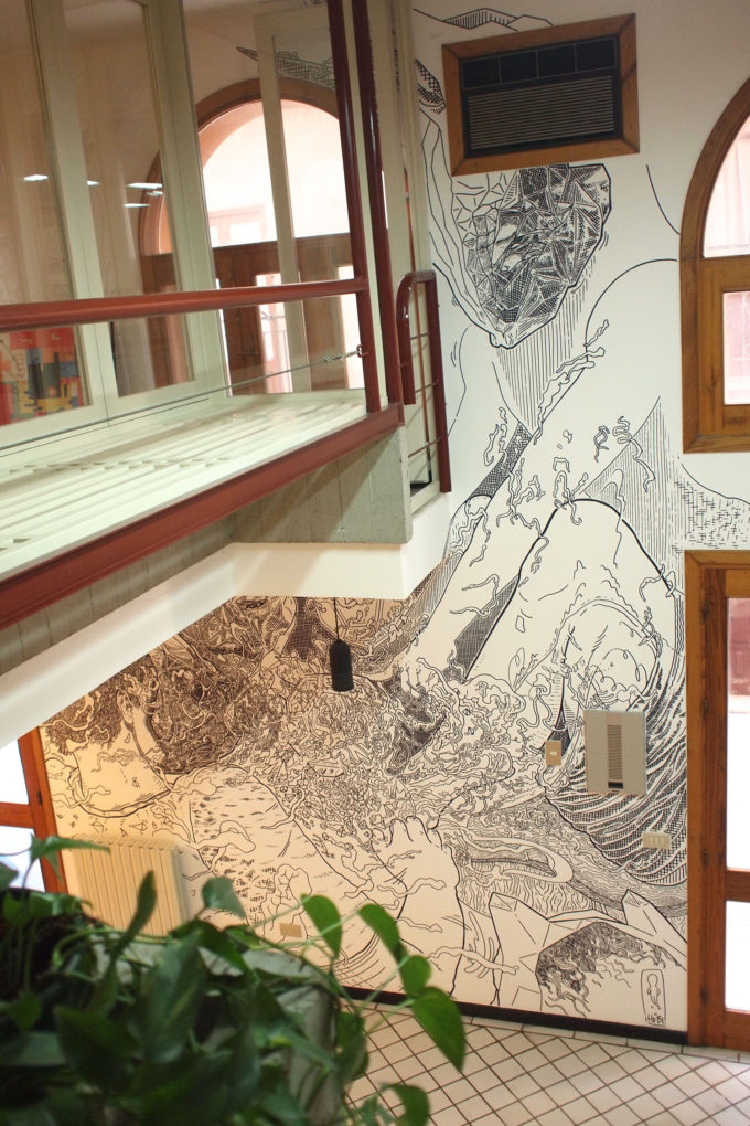 Avevo visitato quel posto diversi mesi prima per il lancio del monografico del primo anno di Scribblitti da parte di Slanted. Per l’occasione avevo disegnato durante la sera lungo una vetrata interna.