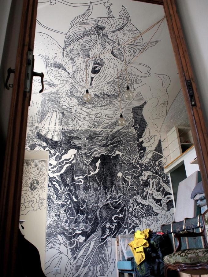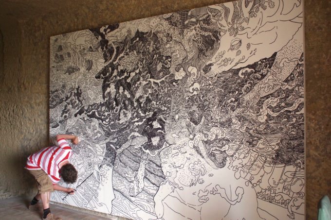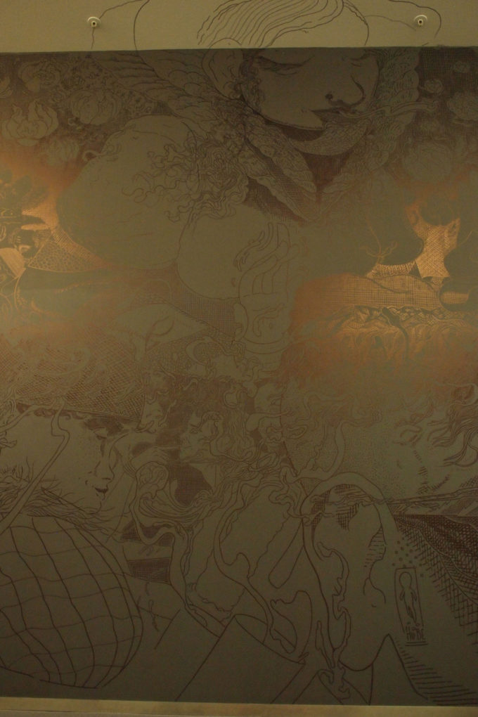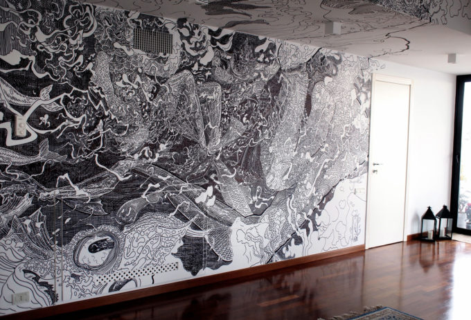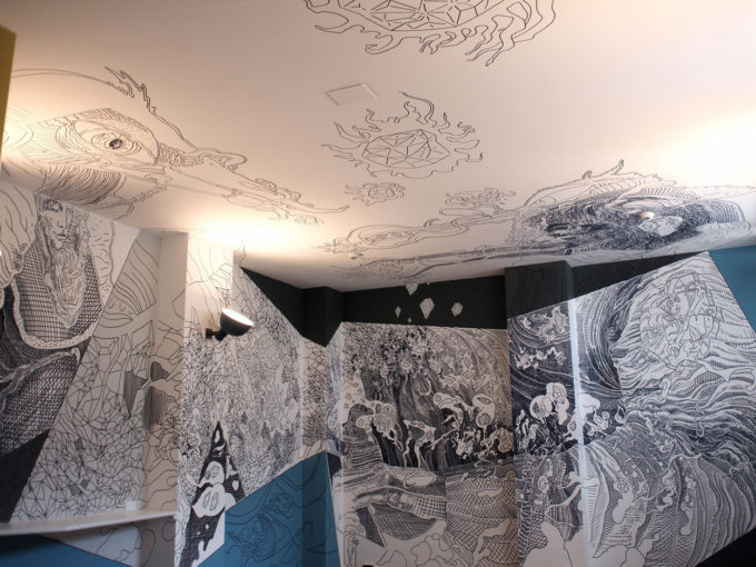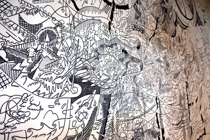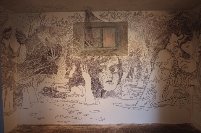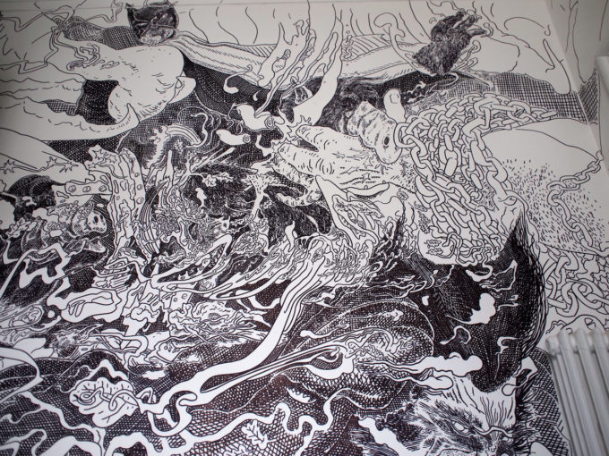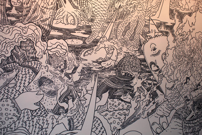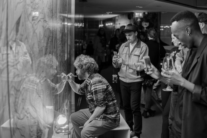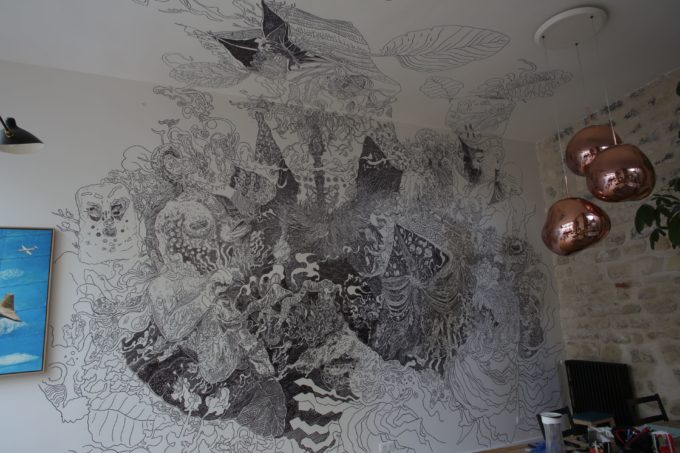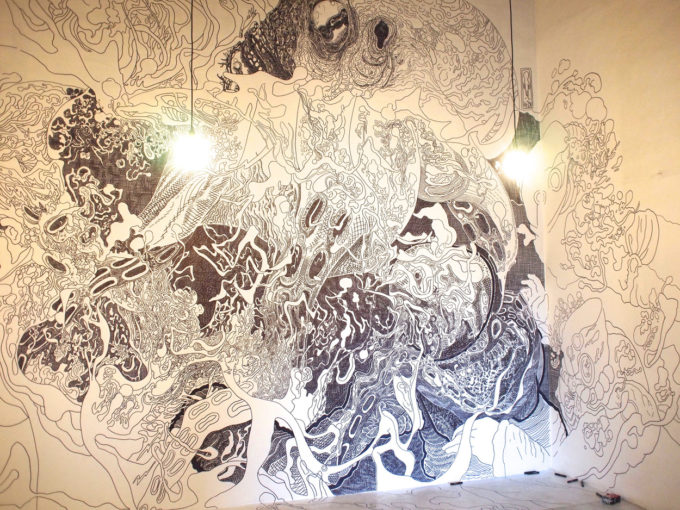 Avevo visitato quel posto diversi mesi prima per il lancio del monografico del primo anno di Scribblitti da parte di Slanted. Per l’occasione avevo disegnato durante la sera lungo una vetrata interna.