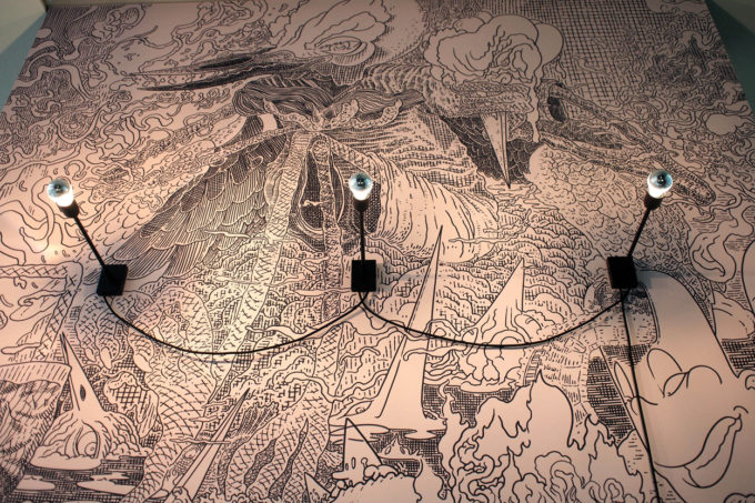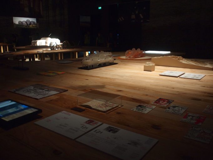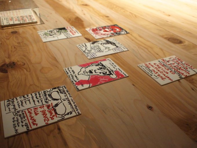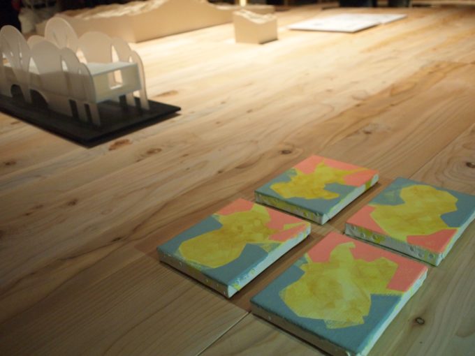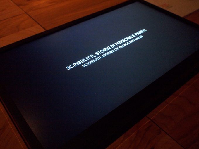 Poco distanti da quello, a testimoniare le giornate passate in Sicilia con il gruppo di architetti che mi aveva invitato per usare Scribblitti come ponte di comunicazione con la popolazione locale attraverso lo staff di Mario Cucinella, curatore del padiglione italiano, c’era un video-documentario di questo progetto e quattro piccoli quadri a tempera che mi erano stati richiesti a stretto giro mentre ero in viaggio, due Natali fa ormai, a meno di venti giorni da quella esperienza, che sarebbero serviti per la realizzazione del poster dell’inaugurazione.