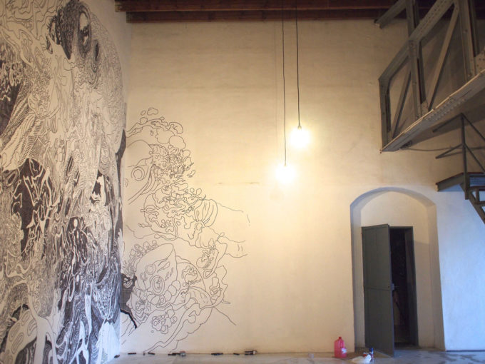 Per la realizzazione degli Scribblitti di questa progettualità dopo l’attività di raccolta delle interviste ho avuto a disposizione tre piccole pareti all’interno di luoghi straordinari. La guardiola del giardino botanico è stata la prima, l’interno di uno dei mulini più antichi della zona la seconda e la cava da cui erano ricavate le pietre caricate poi su nave per la costruzione delle chiese nemmeno troppo limitrofe la terza parete a chiudere l’insieme.