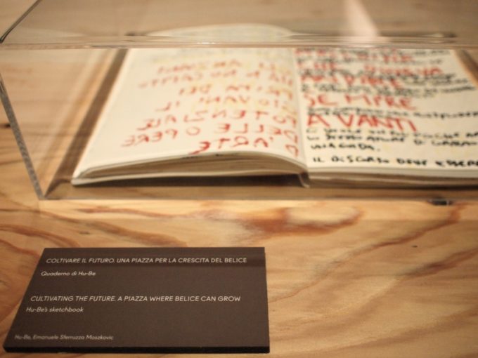 Il lavoro che avevo realizzato in quattro giornate all’interno del teatro di Consagra, che è stato il frutto della partecipazione della comunità gibellinese e dell’ascolto delle loro storie successive al terremoto del Belice, era davanti a lei insieme al mio quaderno, su cui avevo preso appunti e disegnato alcuni schizzi preparatori nei giorni precedenti, sotto una teca.