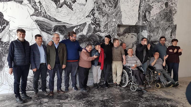 Il mandato ottenuto dal Consorzio di Solidarietà Sociale Oscar Romero e Farmacie Comunali Riunite in estrema sintesi era di capire il significato di Reggio Emilia Città Senza Barriere e di B Diritto alla Bellezza – due upgrade di visione nel campo dell’inclusione sociale rivolti alle persone fragili del territorio – ed applicare il metodo di ascolto e disegno su parete che porto avanti con Scribblitti ad un gruppo di persone ospitate dall’hub di Polveriera riunite in un progetto di atelier dedicato. È così che ho conosciuto la realtà giornaliera del centro socio-occupazionale Nessuno Escluso, focalizzata nel far ottenere a persone fragili strumenti di indipendenza ed autonomia quotidiana molto importanti che la maggior parte di noi sostanzialmente dà totalmente per scontati non avendo mai incontrato la disabilità: dall’imparare l’interazione con le altre persone al ragionare sulle cose, dal prendere un autobus o fare la spesa al riuscire a farsi una piadina a casa, possibilmente senza ferirsi. Cose così, le prime che mi vengono in mente.