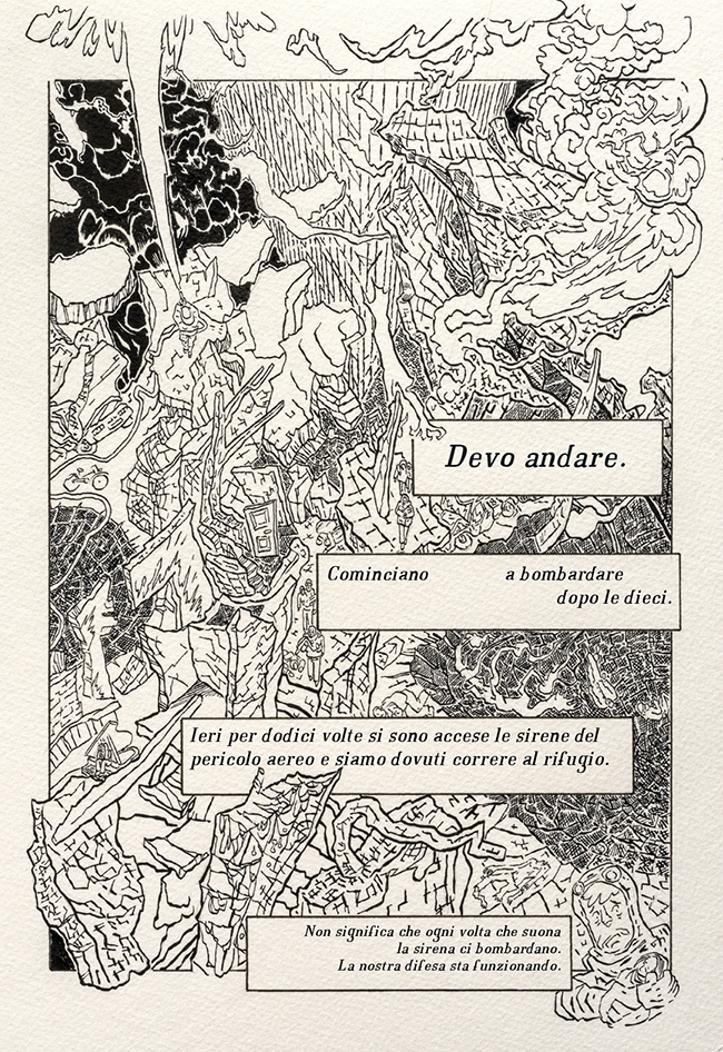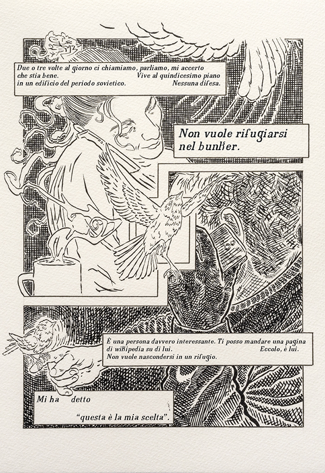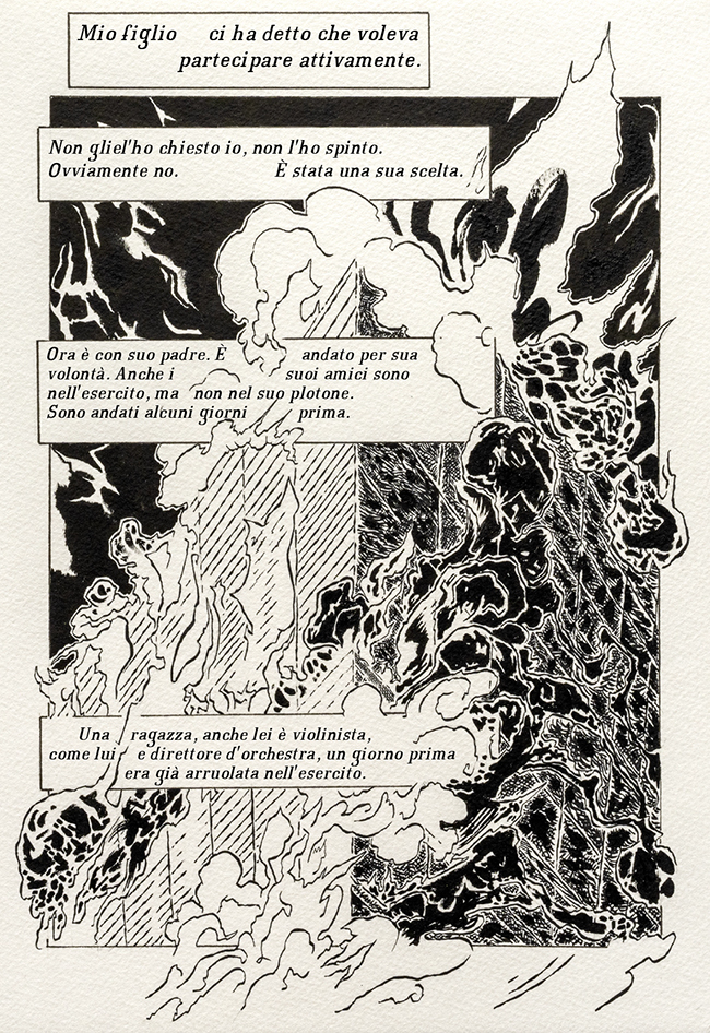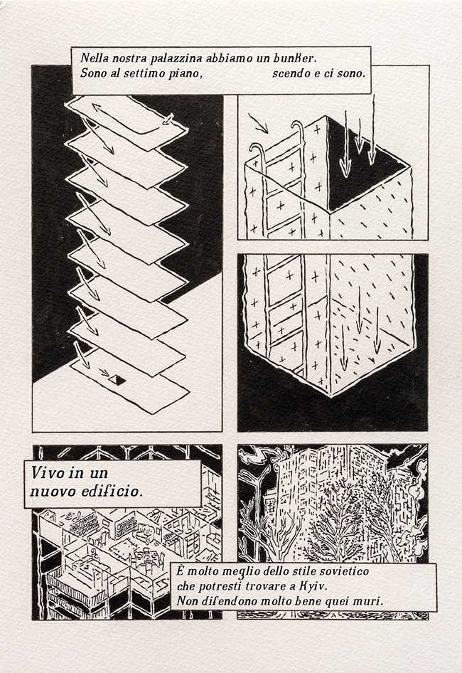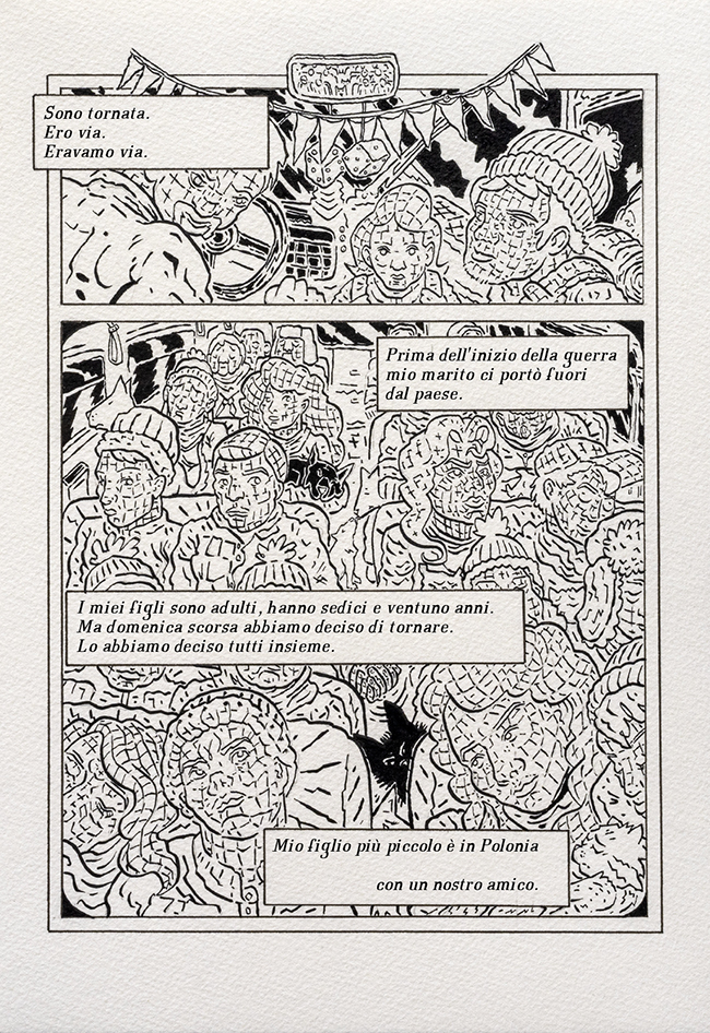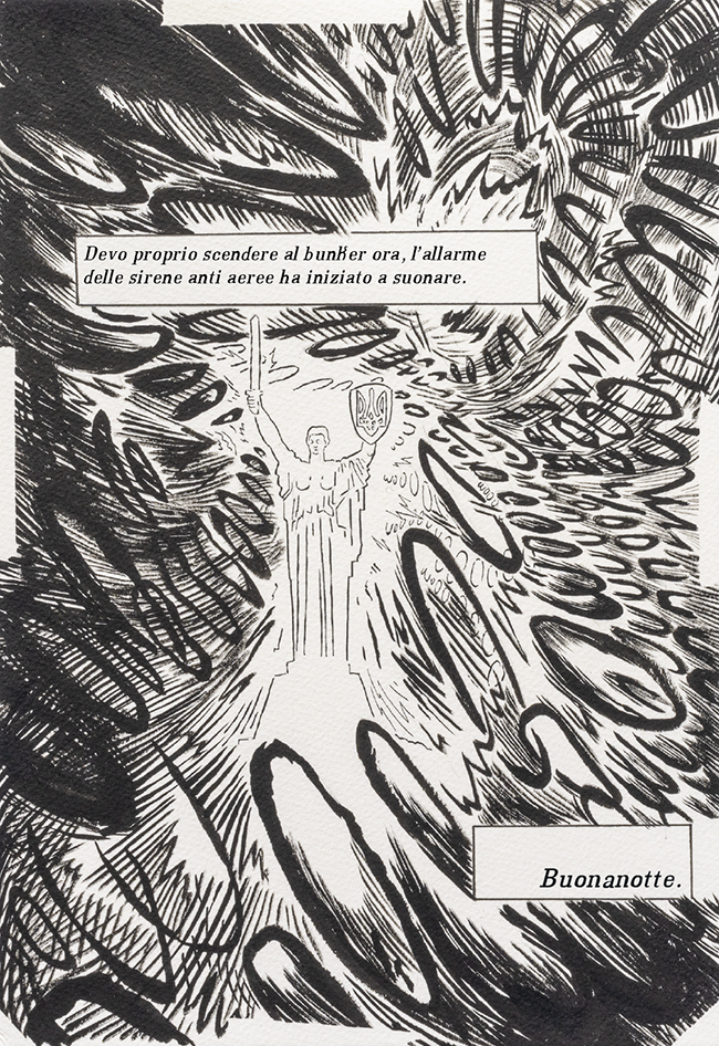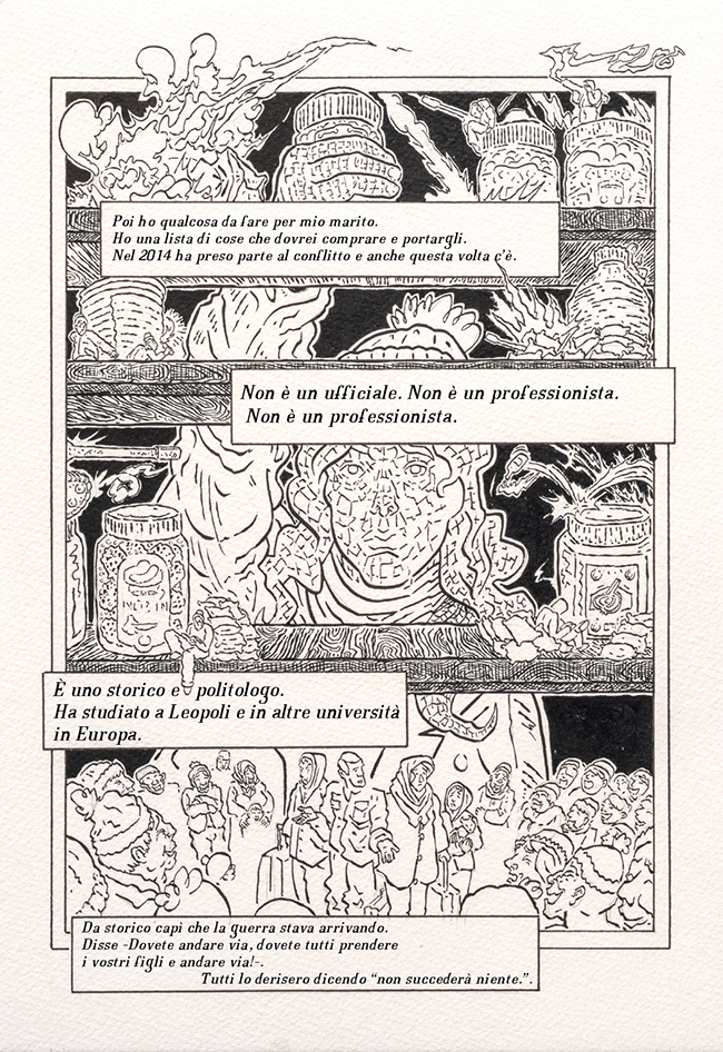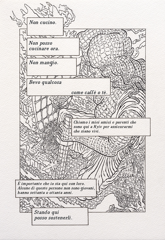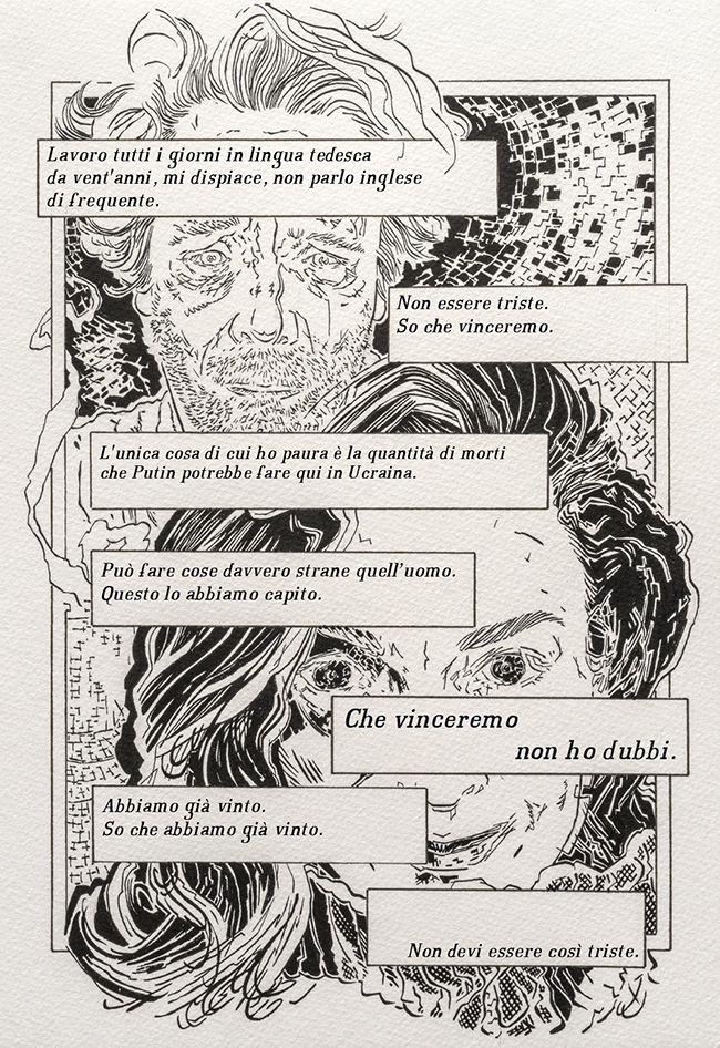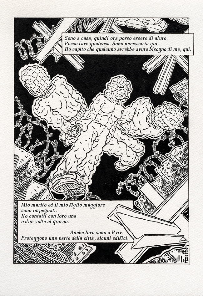La notte del 3 marzo sono entrato in contatto con questa donna a Kyiv. Abbiamo potuto fare una sessione di ascolto di 47 minuti che ho trascritto parola per parola per restituirla fedelmente, come per Scribblitti e per gli altri progetti basati sull’ascolto che porto avanti. Poi è suonato l’allarme anti aereo e ci siamo salutati. Dal mattino dopo fino al 6 Aprile ho disegnato senza risparmiarmi. Spero che questa storia possa essere di aiuto per capire quanto sia importante mettere le persone al centro ed aiutarle con ogni mezzo che si ha a disposizione.